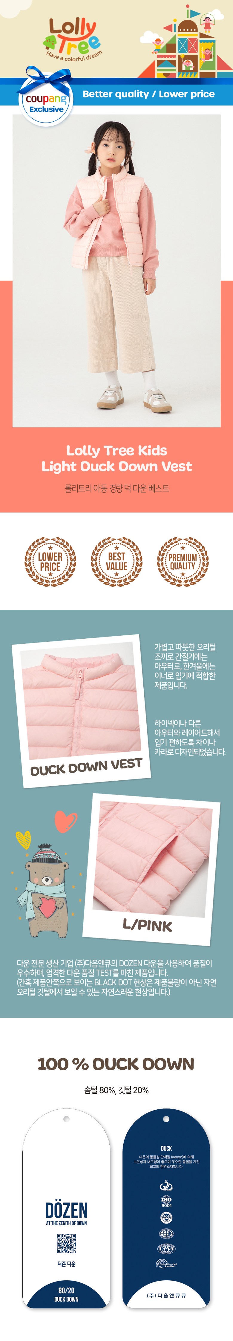 採用優質鴨絨填充,輕盈柔軟,保暖性佳,讓孩子在寒冷的天氣裡也能自由活動,享受舒適溫暖。簡約素色的設計,時尚百搭,無論是單穿還是作為外套內搭,都能輕鬆駕馭各種風格。精緻的細節處理,彰顯品質,呵護孩子嬌嫩的肌膚。 這款羽絨背心採用 (주)다음앤큐 公司生產的 DOZEN 羽絨,經過嚴格的品質測試,確保每一件產品都擁有優良的品質。高品質的羽絨擁有絕佳的蓬鬆度和保暖性,即使在寒冷的冬季也能提供持久的溫暖。簡約大方的設計,適合各種場合穿著,是孩子們秋冬季節的必備單品。