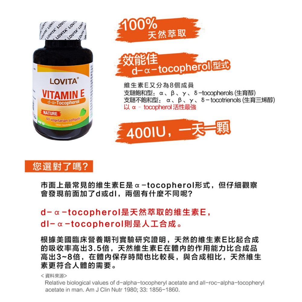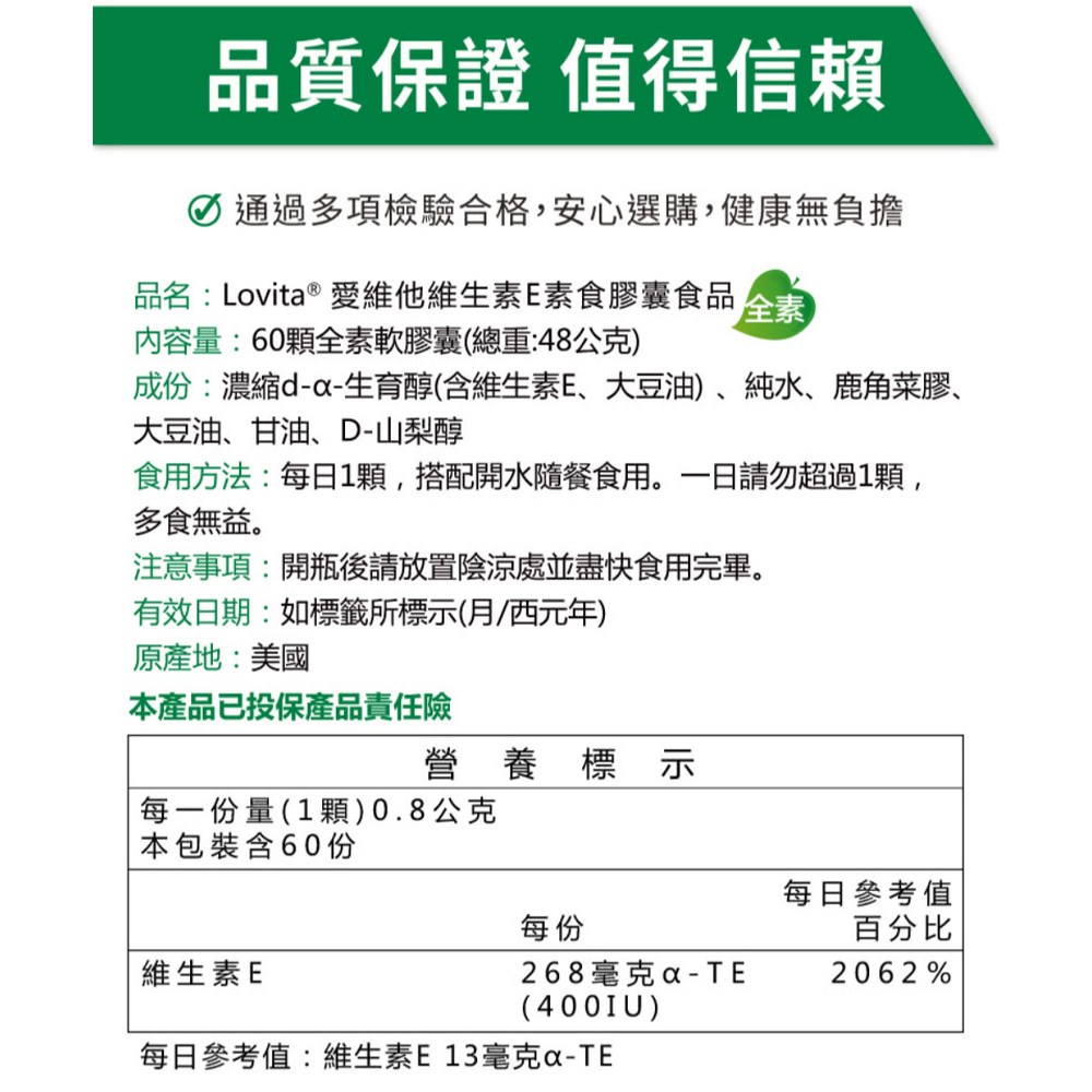 Lovita 維生素E素食膠囊,每罐含60顆,每顆0.8克,總重48克,是您維持健康的理想選擇。本產品提供400IU的維生素E,有助於抗氧化,保護細胞免受自由基的損害。採用素食膠囊,適合各類成人服用,讓您輕鬆補充每日所需的營養。Lovita 維生素E膠囊經過嚴格的品質把關,確保產品的安全性與有效性,讓您安心食用。每日一顆,為您的健康加分。