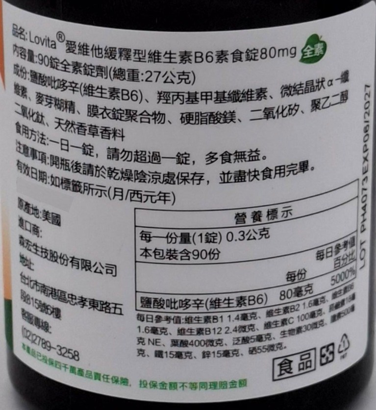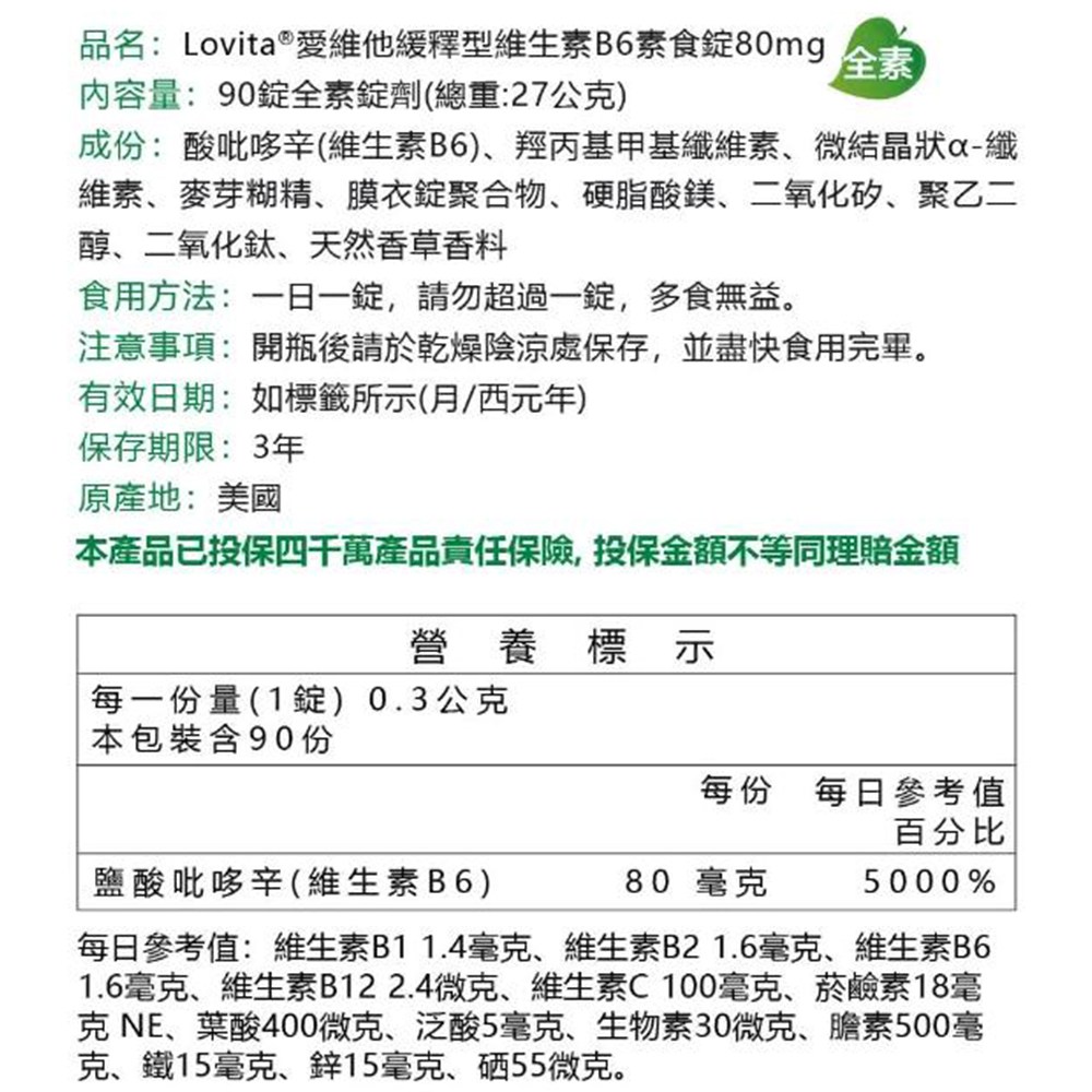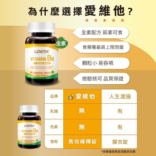 - - Lovita維生素B6,緩釋技術讓營養慢慢釋放,維持身體機能。