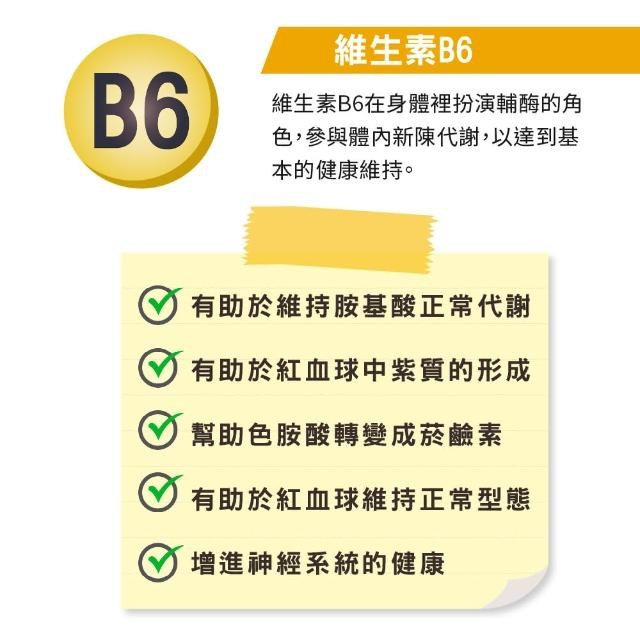 - - 維生素B6有助於維持胺基酸正常代謝,促進健康,提升生活品質。