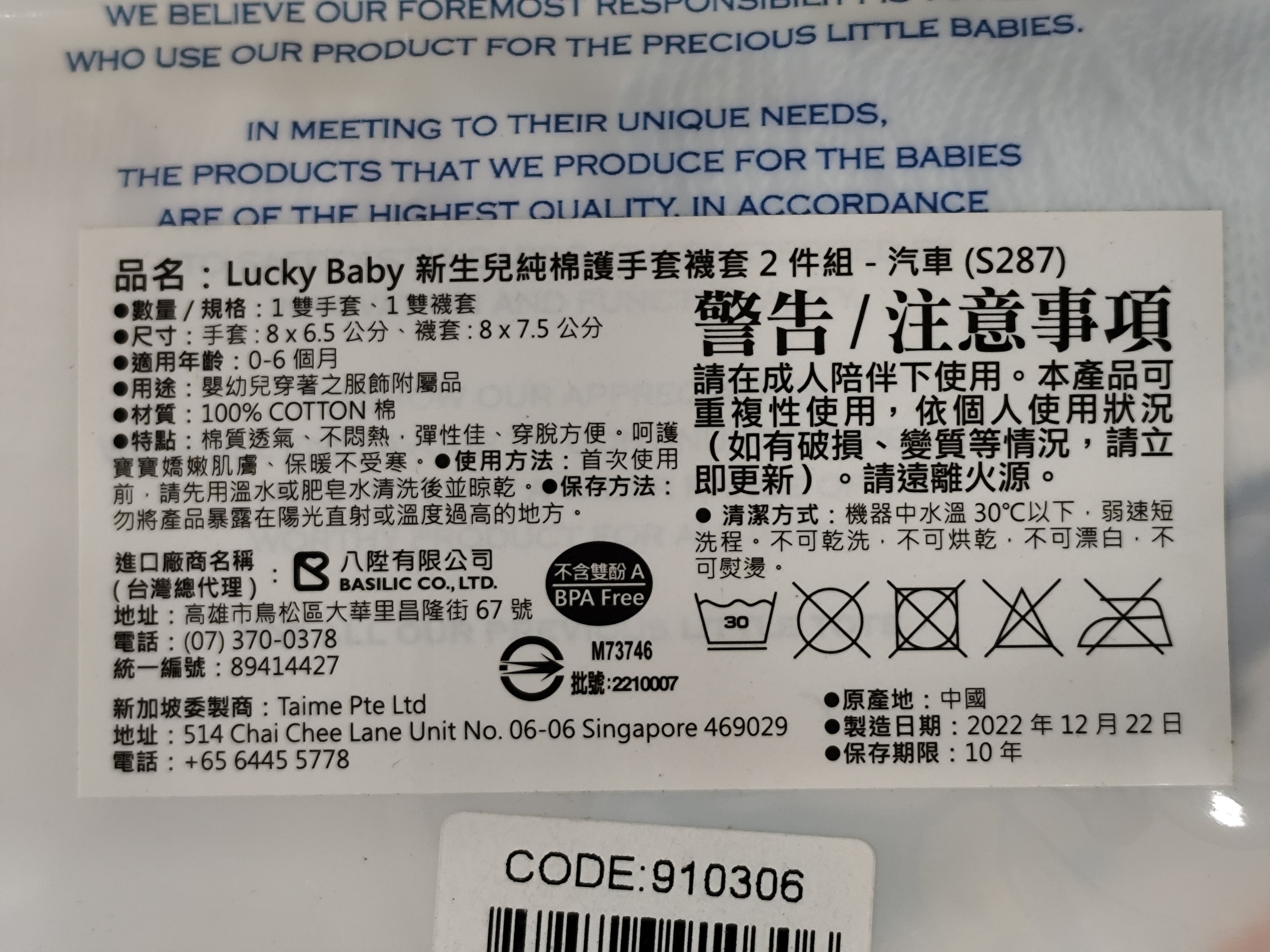 Lucky Baby新生兒純棉護手套襪套2件組,採用柔軟的純棉材質製成,呵護寶寶嬌嫩的肌膚。手套和襪套的組合設計,能有效保護寶寶的小手和小腳,避免受涼。可愛的汽車圖案,讓寶寶穿戴更顯活潑可愛。適用於0~6個月的寶寶,是新手爸媽的必備好物。清洗方便,可於機器中以水溫30℃以下弱速短洗程。