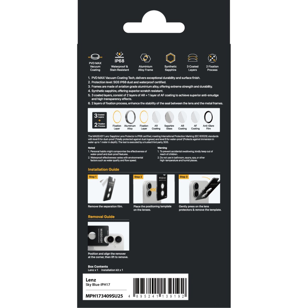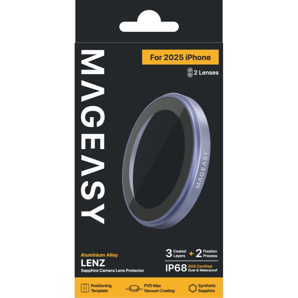 隨著 iPhone 成為日常創作工具,鏡頭保護比以往任何時候都更重要。MAGEASY Lenz 藍寶石鏡頭保護貼使用人造藍寶石製成,並達到真 IP68 防水防塵等級,有效保護你的鏡頭免受刮傷、破裂和污漬影響。三層鍍膜加兩層固定工藝,達到極致透光、抗指紋,確保拍攝清晰無光點。鈦金屬或其他潮流色款隨心挑選,可自由搭配 iPhone 最新色,或凸顯你的自我特色。簡單安裝,一闔即上,現在就享受升級版的 iPhone 攝影體驗吧!