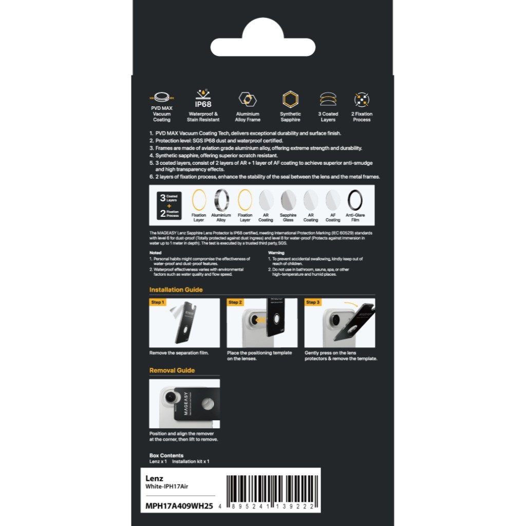 隨著 iPhone 成為日常創作工具,鏡頭保護比以往任何時候都更重要。MAGEASY Lenz 藍寶石鏡頭保護貼使用人造藍寶石製成,並達到真 IP68 防水防塵等級,有效保護你的鏡頭免受刮傷、破裂和污漬影響。三層鍍膜加兩層固定工藝,達到極致透光、抗指紋,確保拍攝清晰無光點。鈦金屬或其他潮流色款隨心挑選,可自由搭配 iPhone 最新色,或凸顯你的自我特色。簡單安裝,一闔即上,現在就享受升級版的 iPhone 攝影體驗吧!