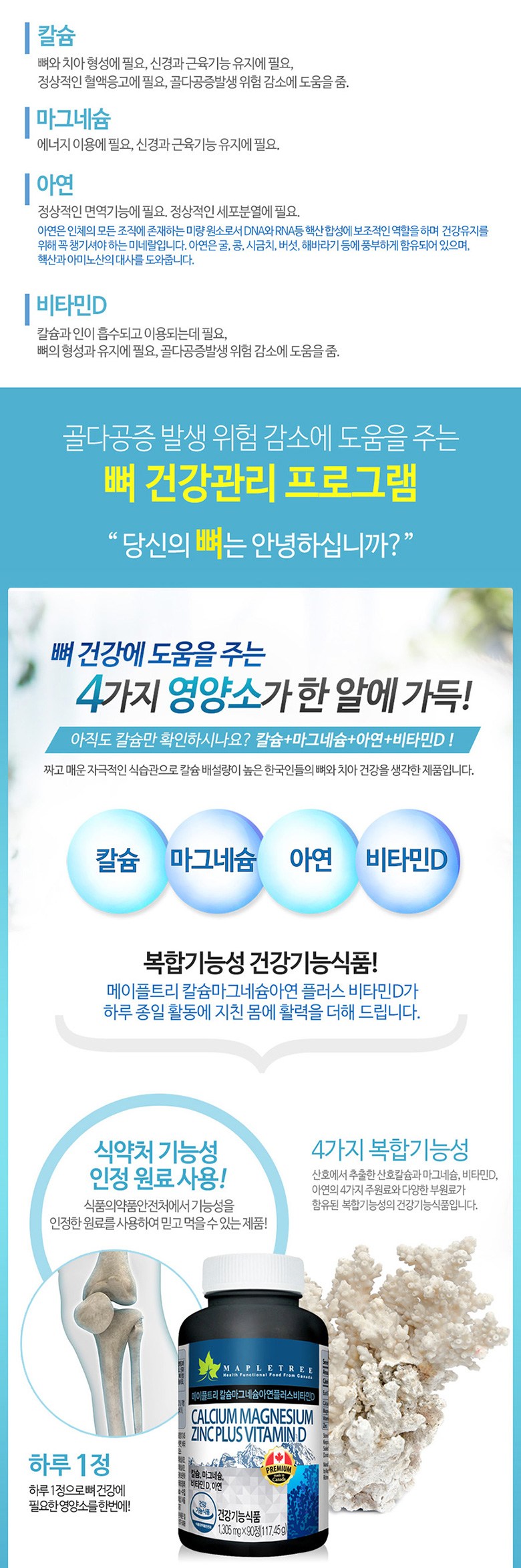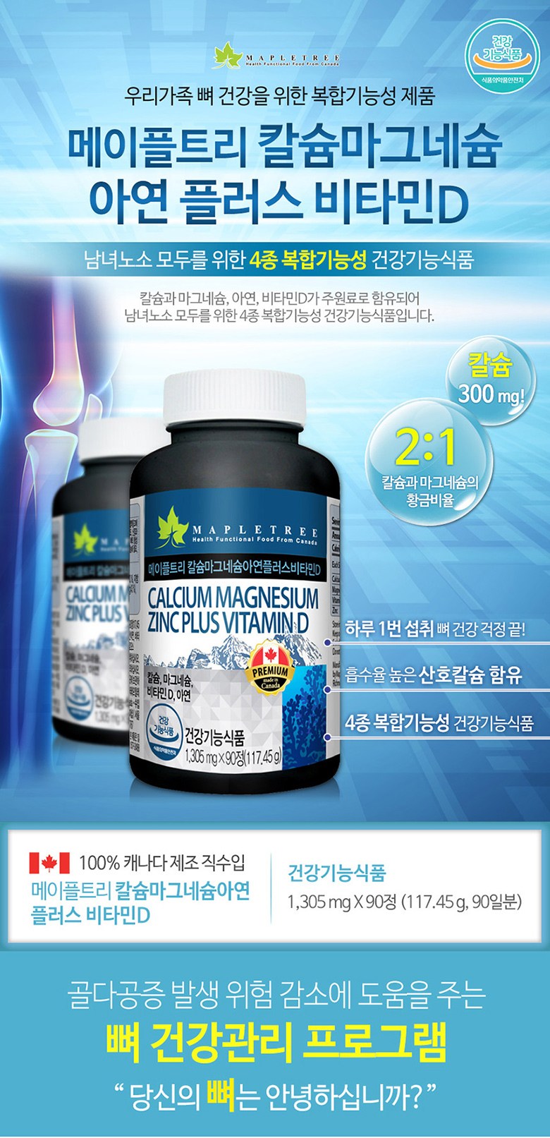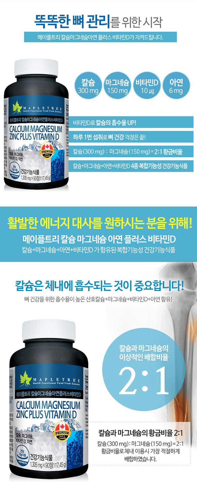 楓樹鈣鎂鋅維他命D補充錠是一款來自加拿大的健康機能食品,專為全家人的骨骼健康設計。本產品結合了鈣、鎂、鋅和維生素D四種關鍵營養素,有助於骨骼和牙齒的形成,維持神經和肌肉功能。每日一錠,即可輕鬆補充所需營養,維持骨骼健康。特別適合成長期兒童、青少年、中年女性、更年期女性以及需要額外鈣質補充的孕婦和哺乳期女性。選擇楓樹鈣鎂鋅維他命D,為您的骨骼健康保駕護航。