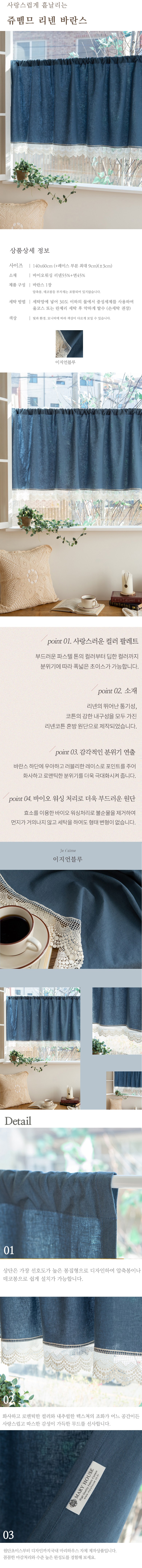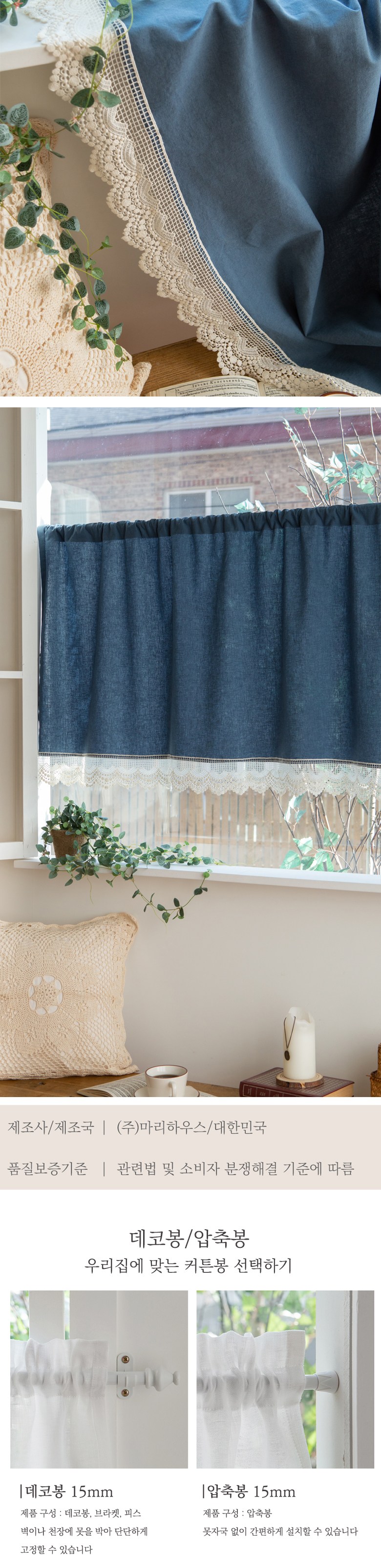 MARYHOUSE Juuneme Cafe亞麻窗簾,採用亞麻棉混紡布料,觸感柔軟舒適,透氣性佳。靛藍色調搭配精緻蕾絲,營造出浪漫溫馨的居家氛圍。穿桿式設計,安裝簡便,可輕鬆搭配伸縮桿或裝飾桿。生物水洗處理,不易變形,清潔方便。為您的居家空間增添一抹清新自然的色彩,打造舒適愜意的生活空間。韓國Mary House自家製作。