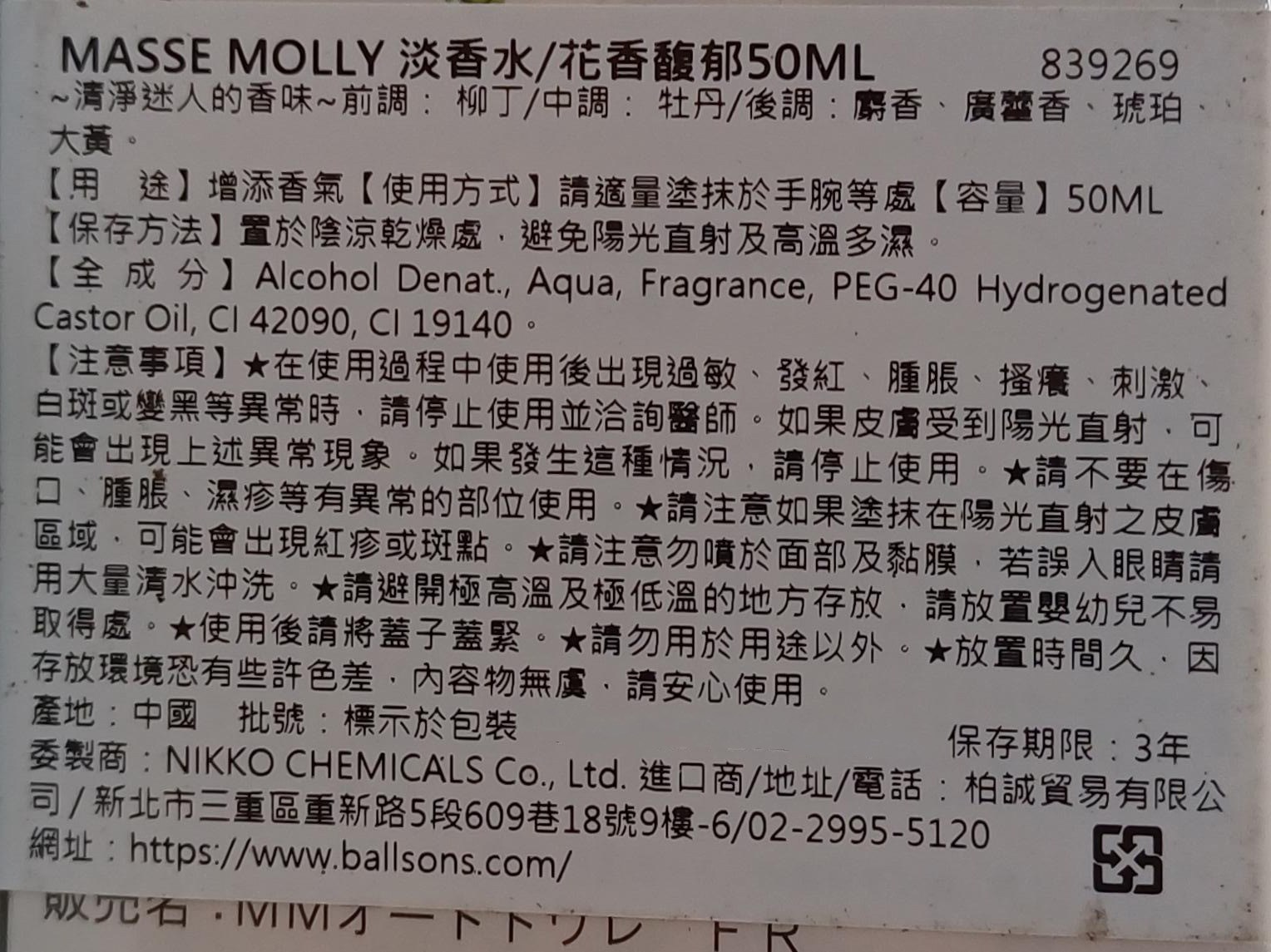 MASSE MOLLY 花香馥郁淡香水,以其清新迷人的香氣,為您增添一抹優雅氣息。前調融合了柳丁的活力,中調則以牡丹的柔美為主,後調則以麝香、廣藿香、琥珀和大黃的溫暖作結,帶來豐富而有層次的香氛體驗。這款淡香水容量為50ml,適合日常使用,讓您在舉手投足間散發自信魅力。使用時請避開傷口、腫脹等異常部位,並避免陽光直射,以確保最佳使用效果。若使用後出現不適,請立即停止使用並諮詢醫生。