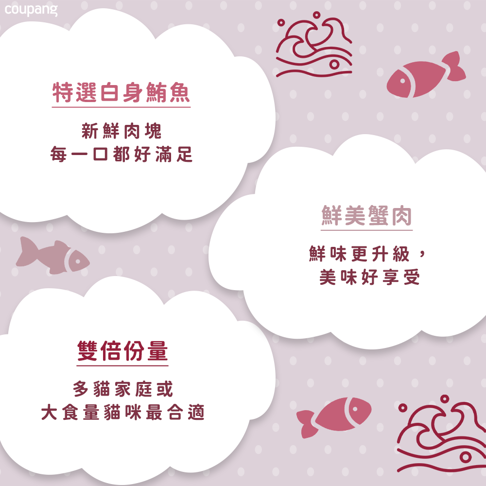 - 精選鮪魚搭配蟹肉,提供豐富蛋白質,讓貓咪享受美味同時補充營養,健康成長。