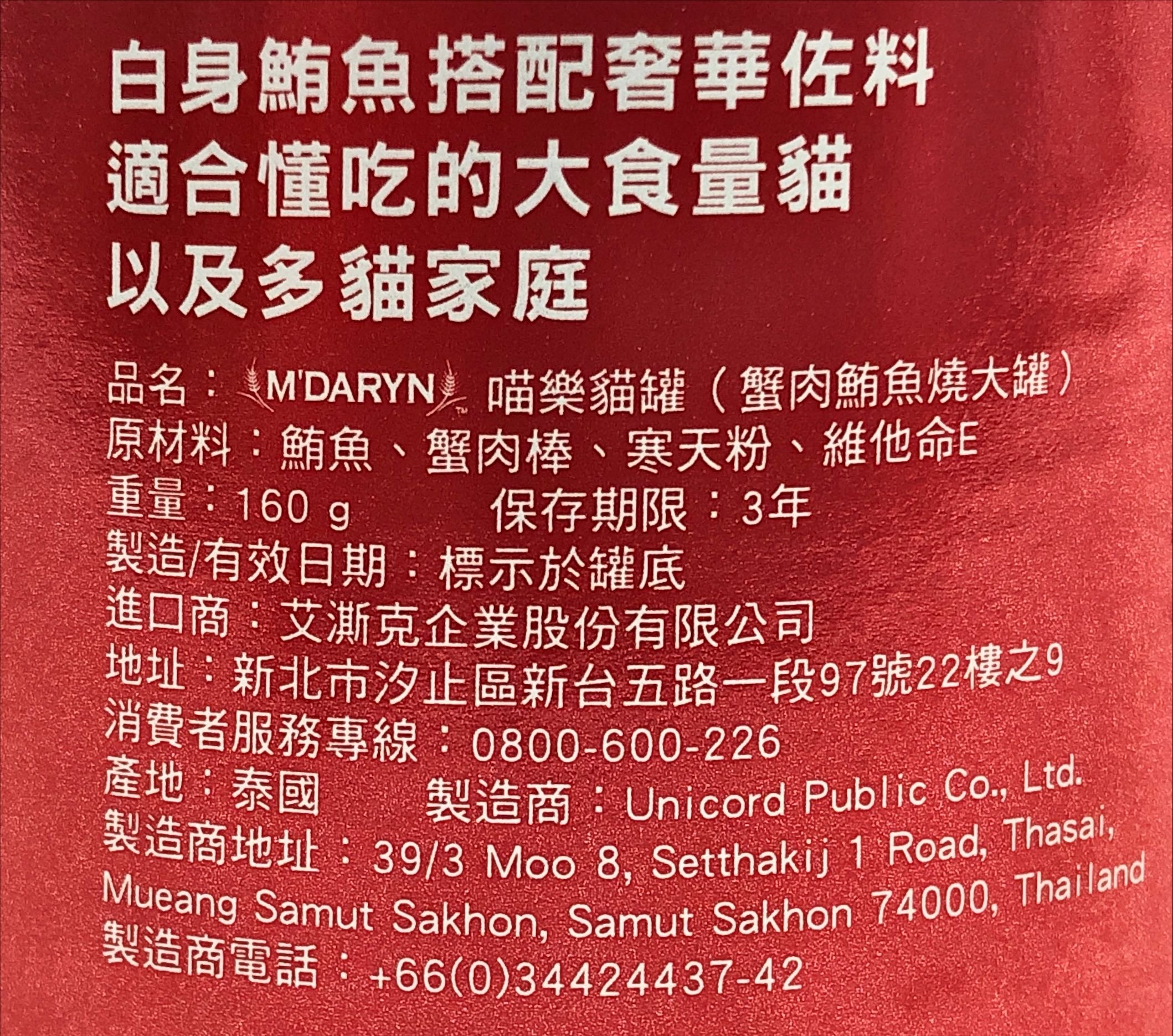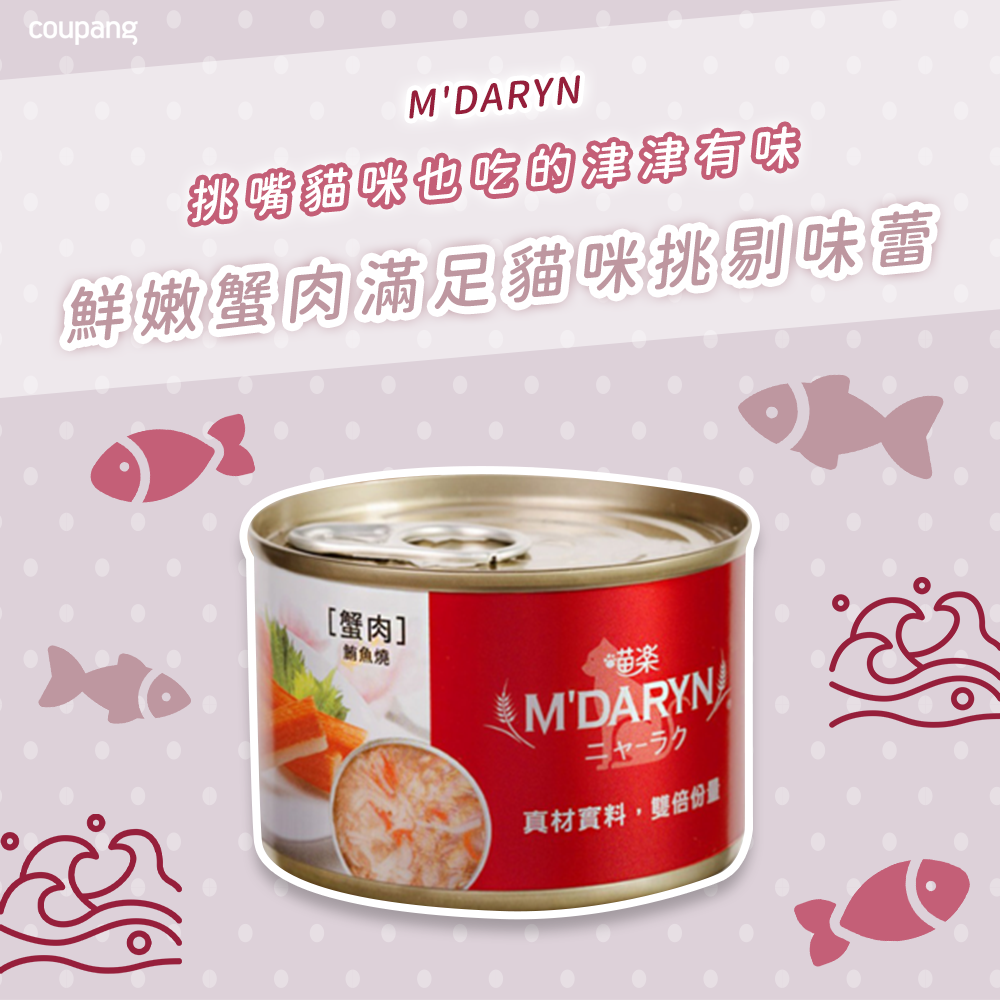 為您的愛貓提供美味又營養的[箱裝] M'DARYN 喵樂 鮪魚燒大罐 蟹肉!這款濕糧採用特選鮪魚搭配鮮美蟹肉,提供豐富的蛋白質和必需營養素,讓您的貓咪健康有活力。每罐160克的份量,一箱24罐的包裝,適合多貓家庭或食量較大的貓咪。喵樂濕糧不僅美味可口,還能幫助貓咪補充水分,維持泌尿系統健康。給您的愛貓最好的,就選M'DARYN 喵樂鮪魚燒蟹肉口味!