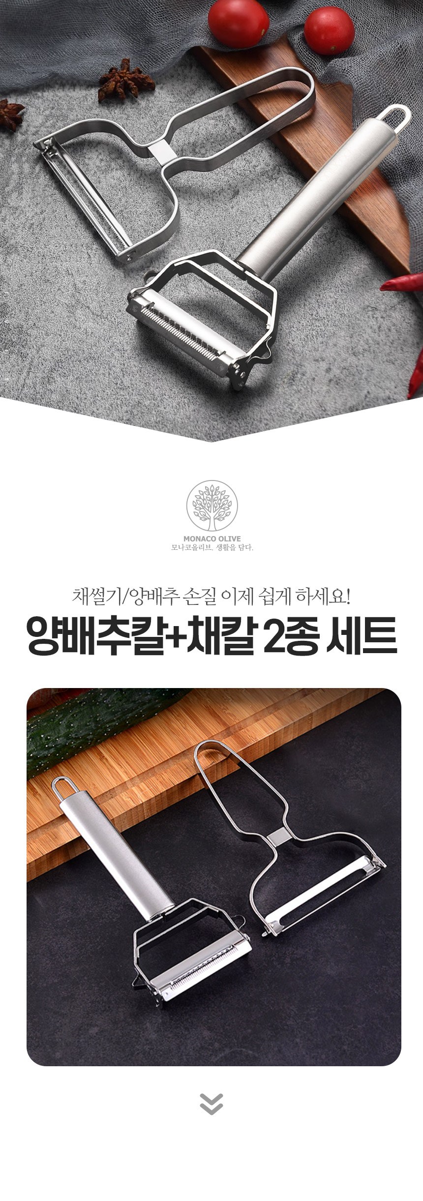 MONACO OLIVE全不鏽鋼捲心菜刀+削皮刀套裝,採用全不鏽鋼材質,堅固耐用且易於清潔。高麗菜刀搭配精密加工的鋒利刀片,無需專業刀工即可快速切絲,輕鬆製作各式料理。多功能削皮刀具備雙向刀片,不僅能快速削皮,還能進行刨絲和切片處理,一物多用。使用後可用洗碗機或熱水消毒,確保衛生。此套裝讓您輕鬆享受烹飪樂趣,是廚房不可或缺的好幫手。