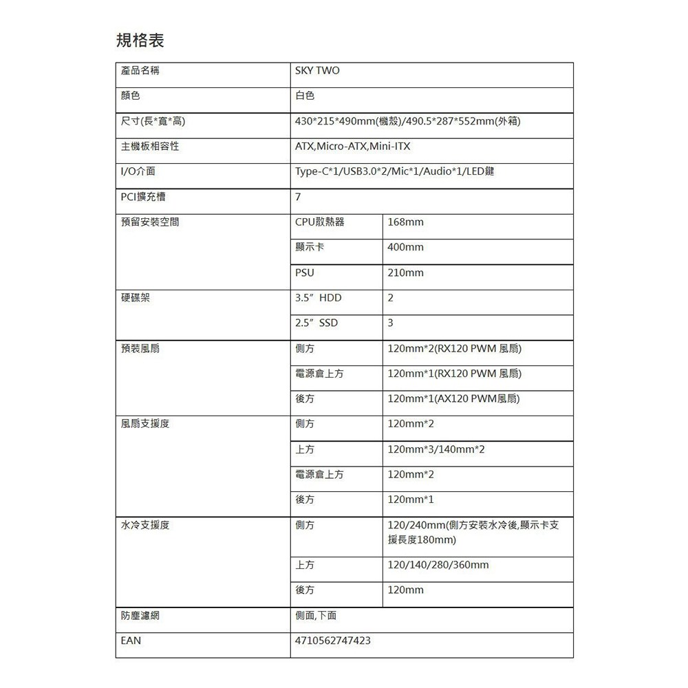 - 中塔式機殼內部空間寬敞,輕鬆安裝各種尺寸主機板,擴充性極佳。