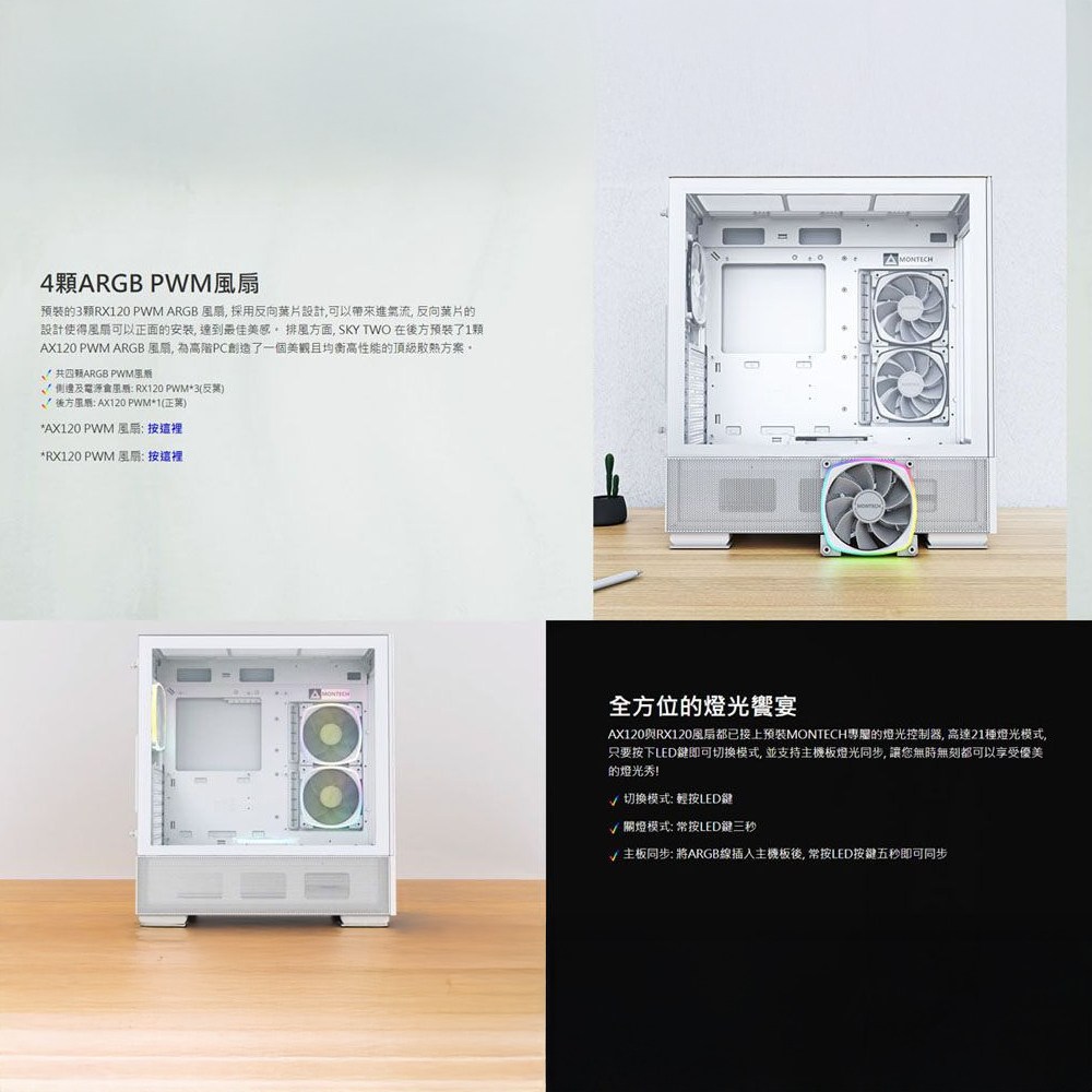MONTECH 君主 SKY TWO 白色電腦機殼 預裝4顆 ARGB PWM風扇 支援ATX/Micro-ATX/Mini-ITX, 1個