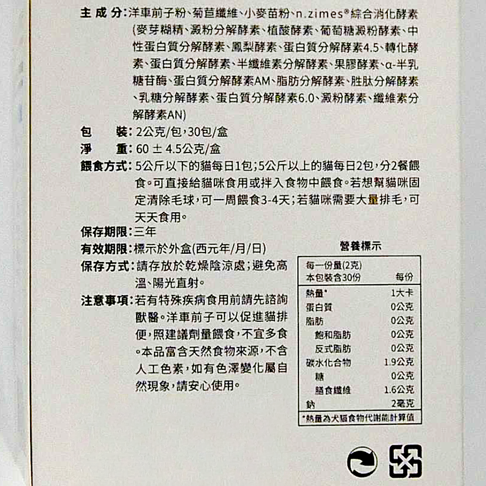 - 高纖配方促進腸道蠕動,溫和排出體內毛髮,告別惱人的毛球症狀,維持腸道機能。