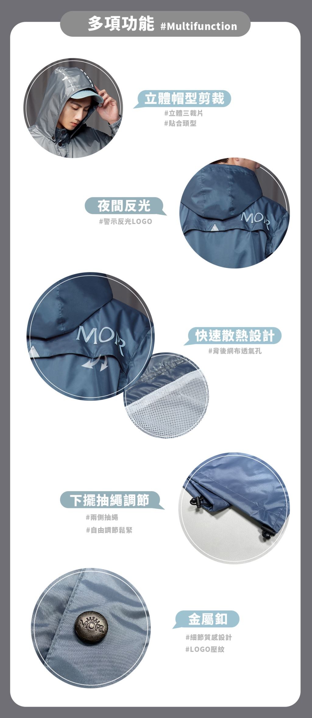 MORR輕裝防水外套,採用2L輕量機能布料,提供出色的防水保護,讓您在多變天氣中保持乾爽舒適。普魯士藍的配色時尚百搭,適合各種戶外活動和日常穿搭。立體帽型剪裁貼合頭型,後背網布透氣孔設計,快速散熱,保持乾爽。下擺抽繩調節設計,可自由調節鬆緊,金屬鈕扣質感精緻,彰顯品牌細節。