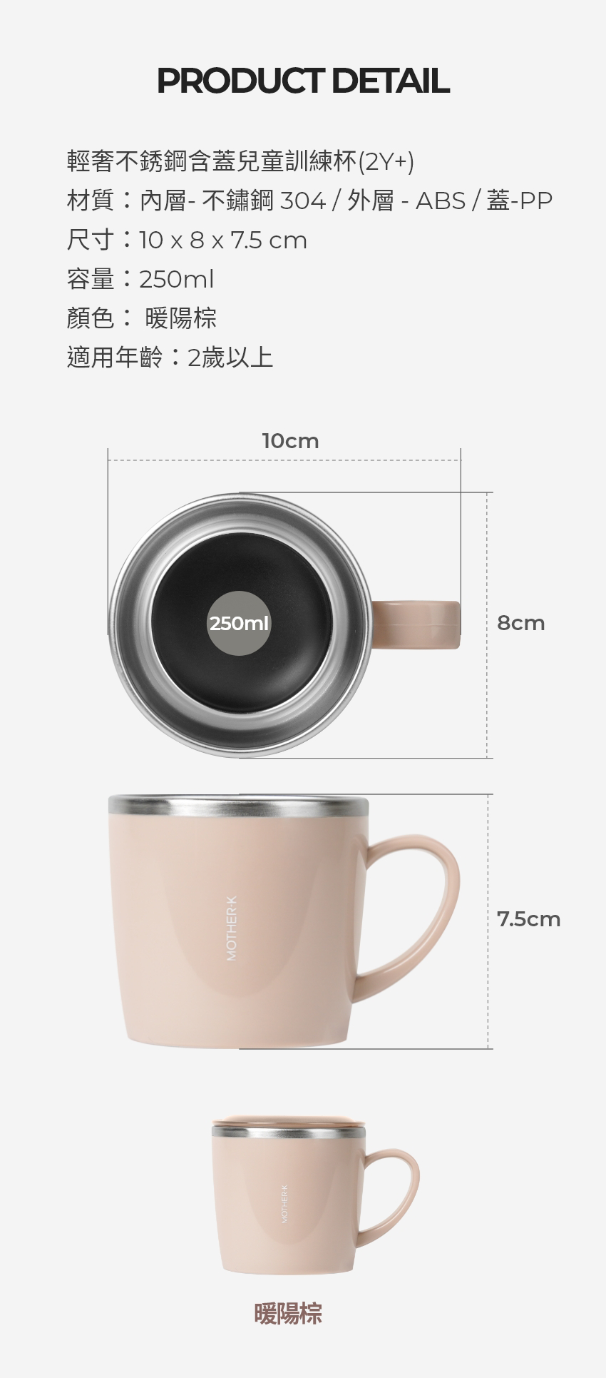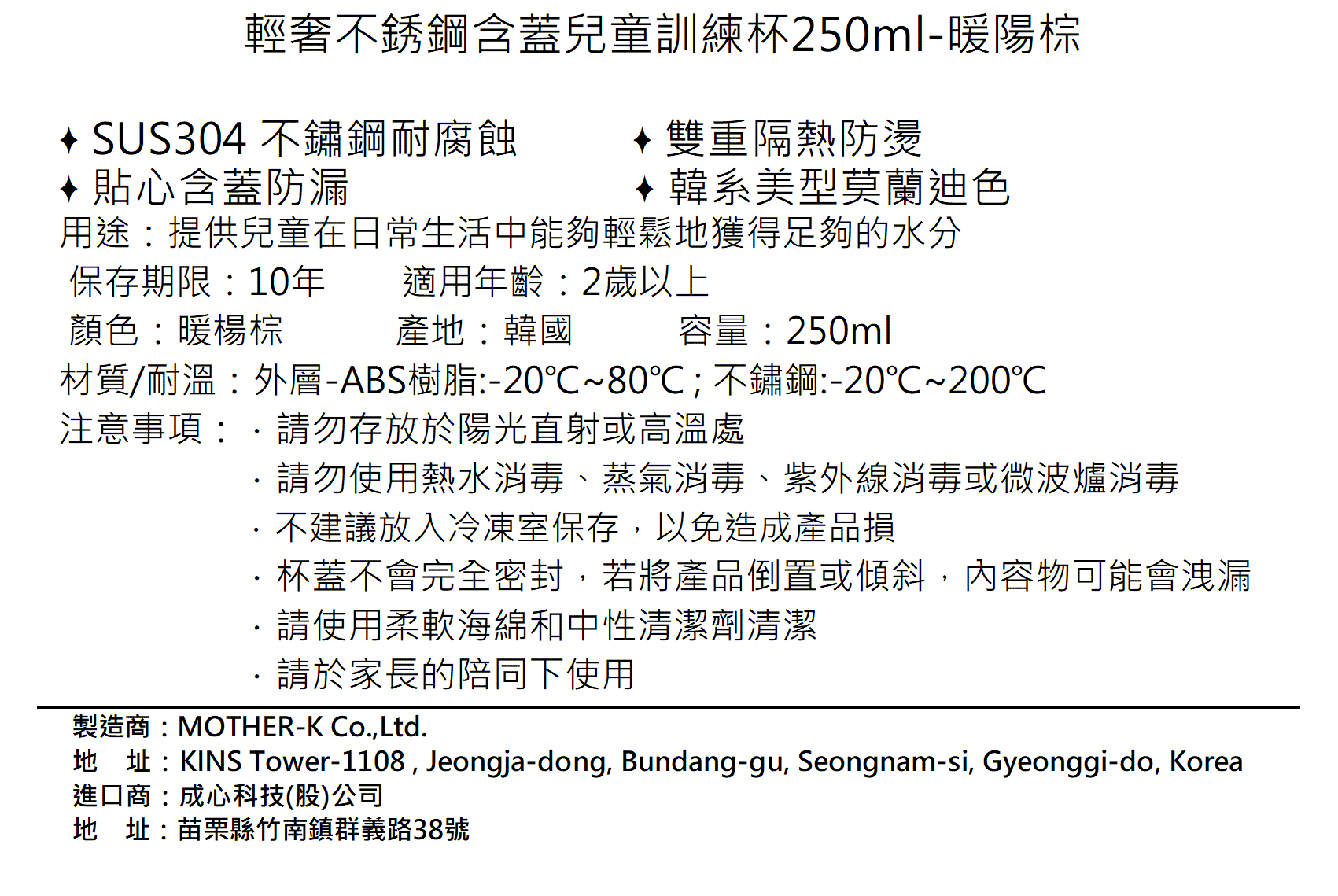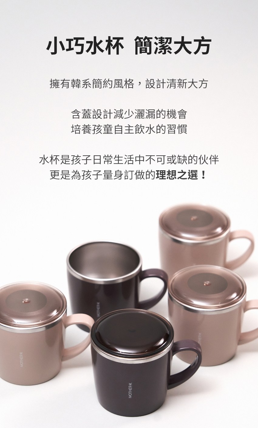 MOTHER-K 輕奢不鏽鋼兒童訓練杯,以其暖陽棕的溫暖色調和250ml的適中容量,成為寶寶學習獨立飲水的理想選擇。這款訓練杯採用雙層結構設計,內層為304不鏽鋼,確保飲品安全無虞,且易於清潔,外層則使用ABS樹脂,提供隔熱防燙效果,讓寶寶的小手可以輕鬆握持。貼心的含蓋設計,培養寶寶良好的飲水習慣。不論在家或外出,這款輕巧耐用的訓練杯都能讓寶寶隨時補充水分,養成健康的生活方式。此外,產品通過嚴格的品質檢測,讓您安心使用。