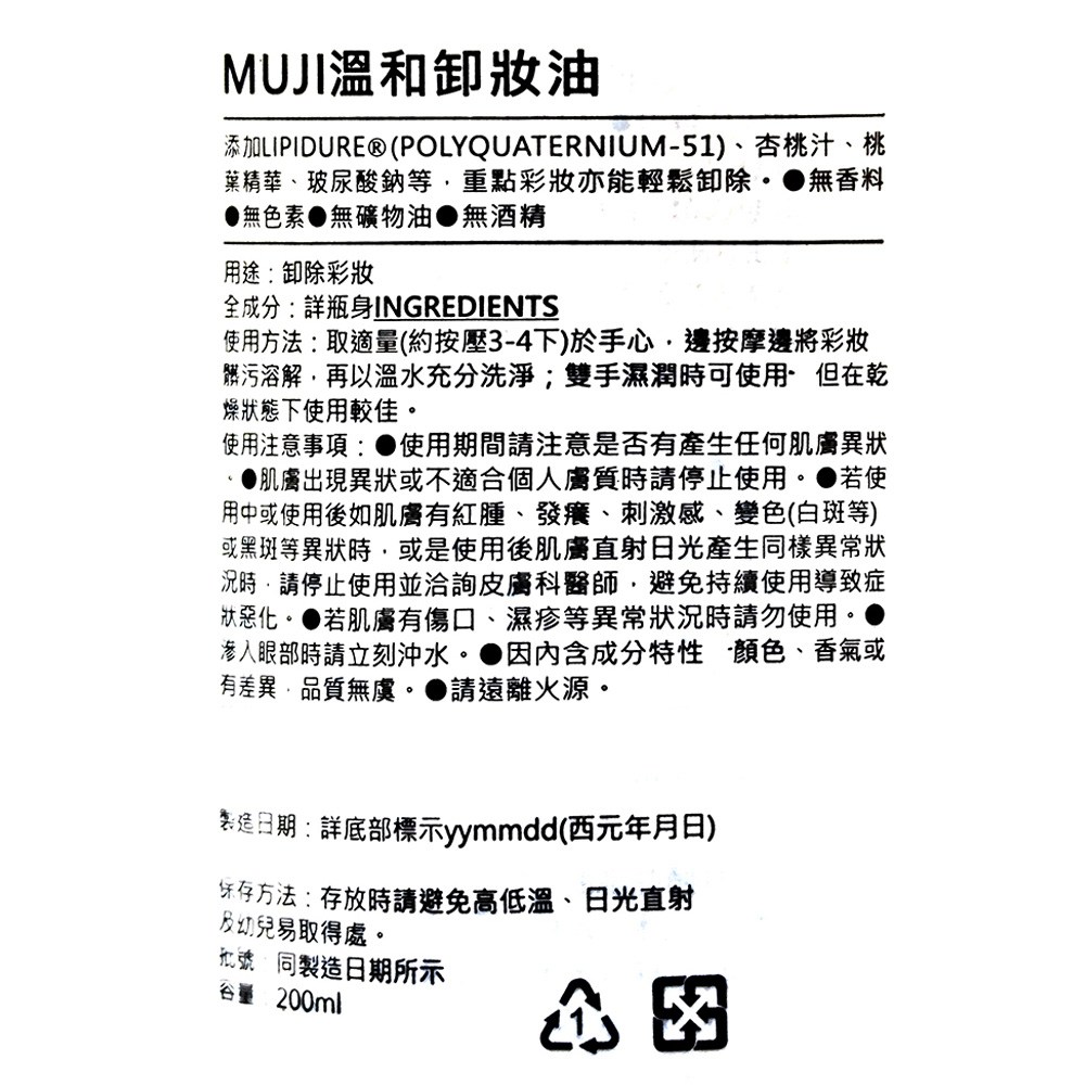 - 無印良品卸妝油不含香料、色素、礦物油及酒精,使用起來更加安心。