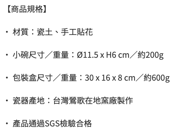 Mao's 樂陶陶日日祝福圓滿順心雙碗禮盒組,為您帶來滿滿的祝福與順心如意。這款精緻的陶瓷碗套裝,不僅材質安全通過SGS檢驗合格,讓您安心使用,更在台灣鶯歌在地窯廠製作,展現道地工藝。碗身設計簡約大方,分別印有「圓滿」與「順心」字樣,寓意美好,為您的餐桌增添一份溫馨與祝福。無論是自用或送禮,這款禮盒組都能傳達您真摯的心意,讓每一天都充滿喜悅與圓滿。包裝盒尺寸為30 x 16 x 8 cm,重量約600g,送禮大方得體。