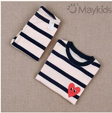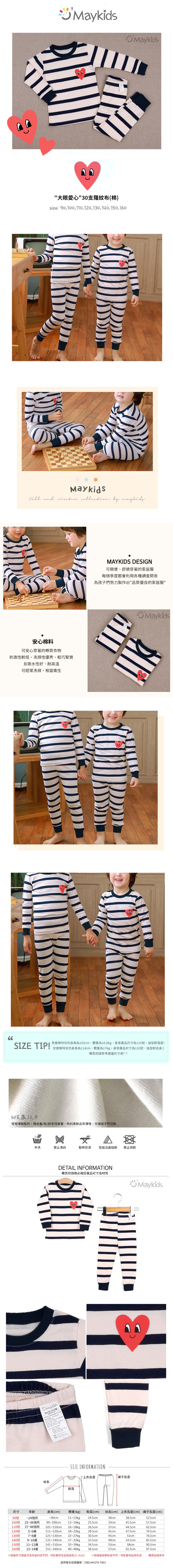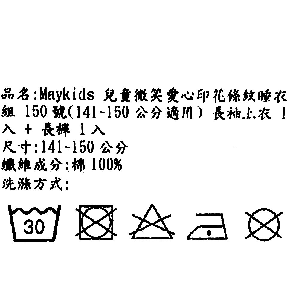 Maykids兒童微笑愛心印花條紋睡衣組,採用30支羅紋布(棉)製成,觸感柔軟舒適,透氣性佳,呵護孩子嬌嫩的肌膚。可愛的微笑愛心印花搭配經典條紋設計,色彩鮮明活潑,讓孩子們愛不釋手。長袖上衣和長褲的搭配,提供完整的包覆性,適合春秋季節穿著,讓孩子在舒適溫暖的環境中安心入睡。此款睡衣經過KC認證,品質安全有保障,讓家長買得放心。清洗方便,可機洗,讓忙碌的父母省時省力。