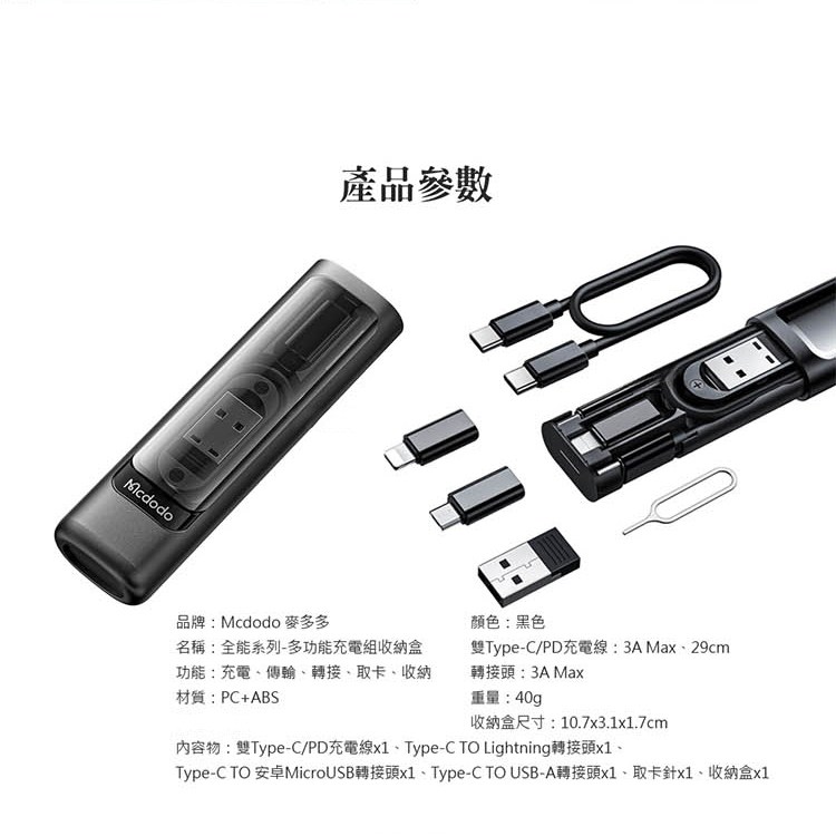 Mcdodo全能系列多功能充電組收納盒,是您解決充電線材雜亂問題的最佳方案。這款收納盒不僅能整齊收納您的充電線和轉接頭,還具備充電、傳輸、轉接、取卡等多種功能。內含雙Type-C/PD充電線以及多種轉接頭,適用於各種設備。輕巧的設計方便攜帶,無論是辦公室、旅行或居家使用都非常適合。告別雜亂,享受便捷生活,Mcdodo讓您的數位生活更加輕鬆有序。