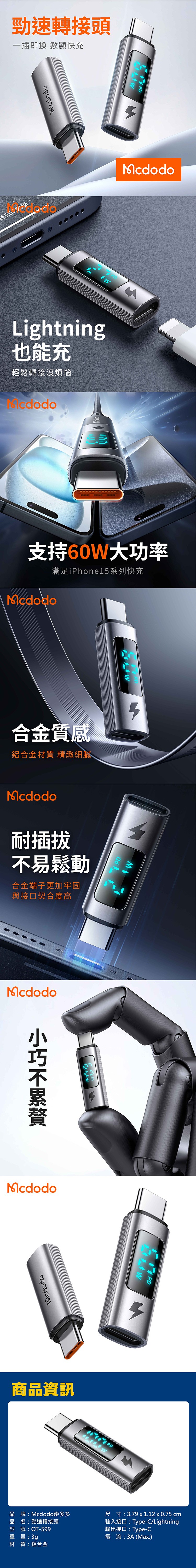 Mcdodo威爾斯系列數顯轉接頭,讓您輕鬆將Lightning接口轉換為Type-C接口,實現60W快速充電。這款轉接頭採用合金材質,堅固耐用,並配有數顯屏幕,可實時顯示充電功率,讓您隨時掌握充電狀態。內置E-Marker晶片,能智能調節電流,確保充電穩定安全。無論是為iPhone 15系列手機快速充電,還是在MacBook/iPad上為蘋果手機充電,這款轉接頭都能滿足您的需求。小巧輕便的設計,方便攜帶,讓您隨時隨地享受便捷的充電體驗。