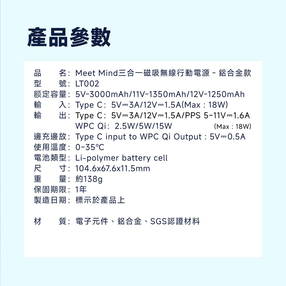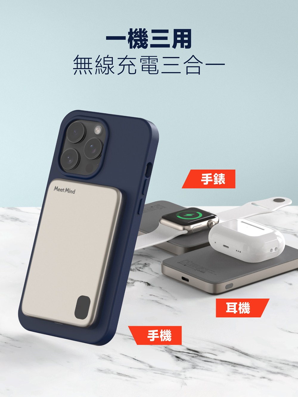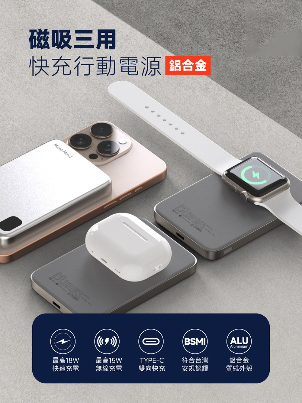 Meet Mind 薄形3合1磁吸行動電源 無線充電 最高15W BSMI安規認證, 鋁合金鈦