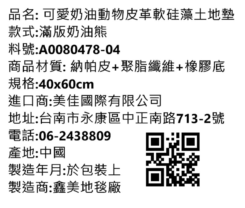 為您的浴室增添一抹可愛氣息!這款【Mega】可愛奶油動物皮革軟硅藻土地墊,以滿版奶油熊的療癒設計,讓您每次踏出浴室都能感受到溫暖。採用納帕皮、聚酯纖維與橡膠底製成,不僅觸感柔軟舒適,更具備卓越的吸水性和防滑效果,確保您和家人的安全。40 x 60cm的尺寸,適合放置於浴室門口、淋浴間旁等位置,保持浴室乾爽清潔。讓這款可愛又實用的腳踏墊,為您的居家生活增添更多樂趣與安心。
