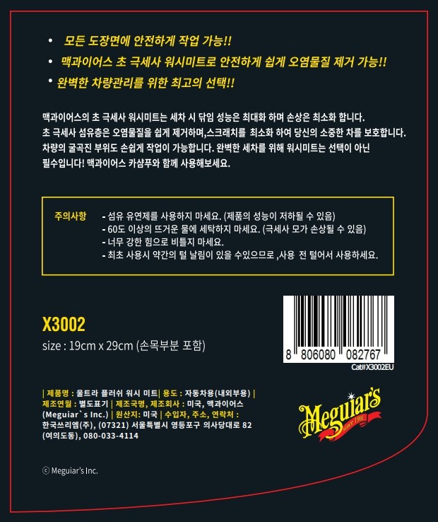 Meguiar's 美光超細纖維洗車手套採用柔軟的超細纖維材質,能有效清潔車身表面的髒汙,同時避免刮傷車漆。手套設計方便使用,能輕鬆深入清潔車身各個角落。此洗車手套吸水力強,可吸收大量水分和泡沫,讓洗車過程更有效率。定期使用美光洗車手套,能讓您的愛車保持光亮如新。使用後易於清洗,可重複使用,是您愛車清潔的最佳選擇。