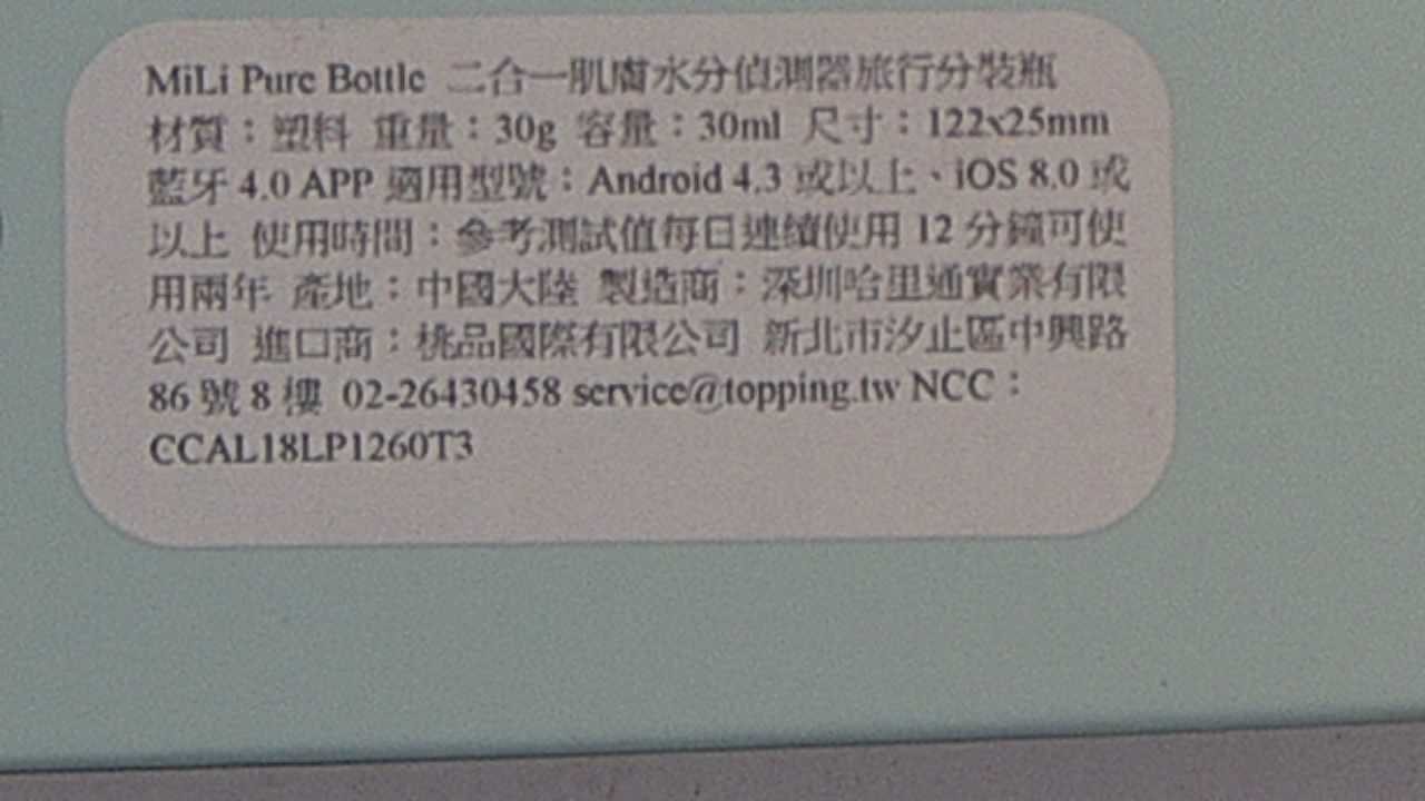 MiLi Pure Bottle 二合一肌膚水分偵測器旅行分裝瓶,是您旅行或日常護膚的理想選擇。這款30ml的分裝瓶不僅輕巧便攜(尺寸:122 x 25mm,重量:30g),更結合了肌膚水分檢測功能,讓您隨時掌握肌膚狀態。採用安全材質製成,確保您的護膚品不受污染,安心使用。無論是精華液、化妝水或其他液態保養品,都能輕鬆分裝,方便攜帶。數量:1個。