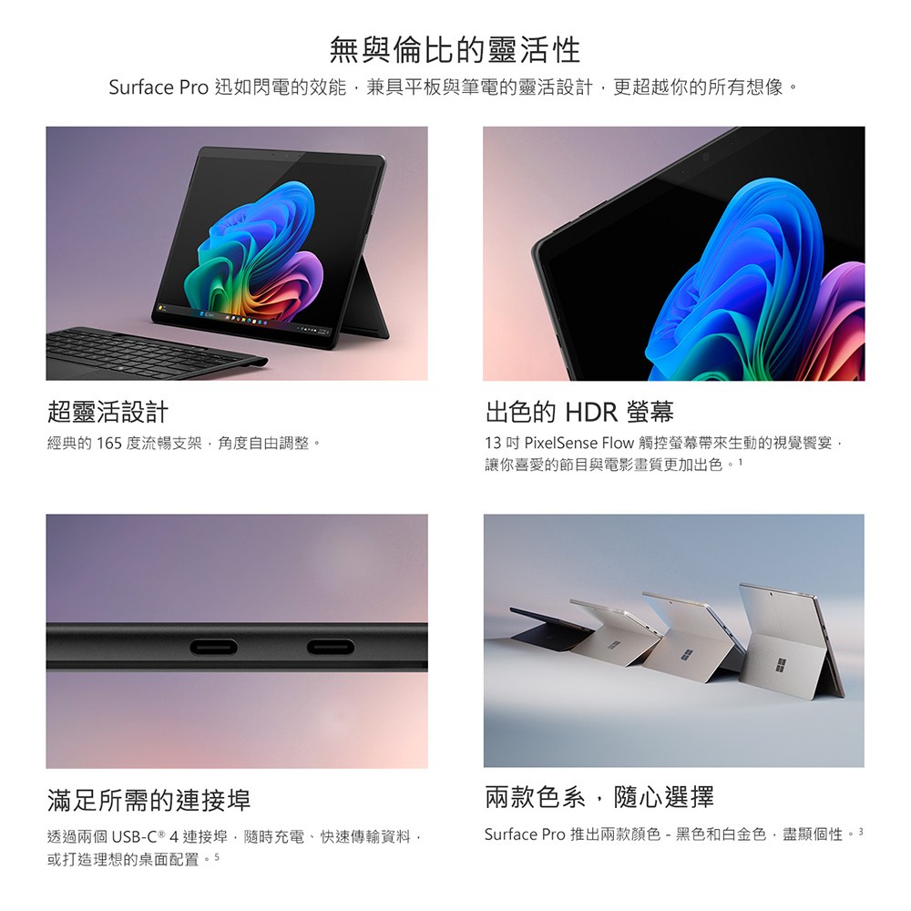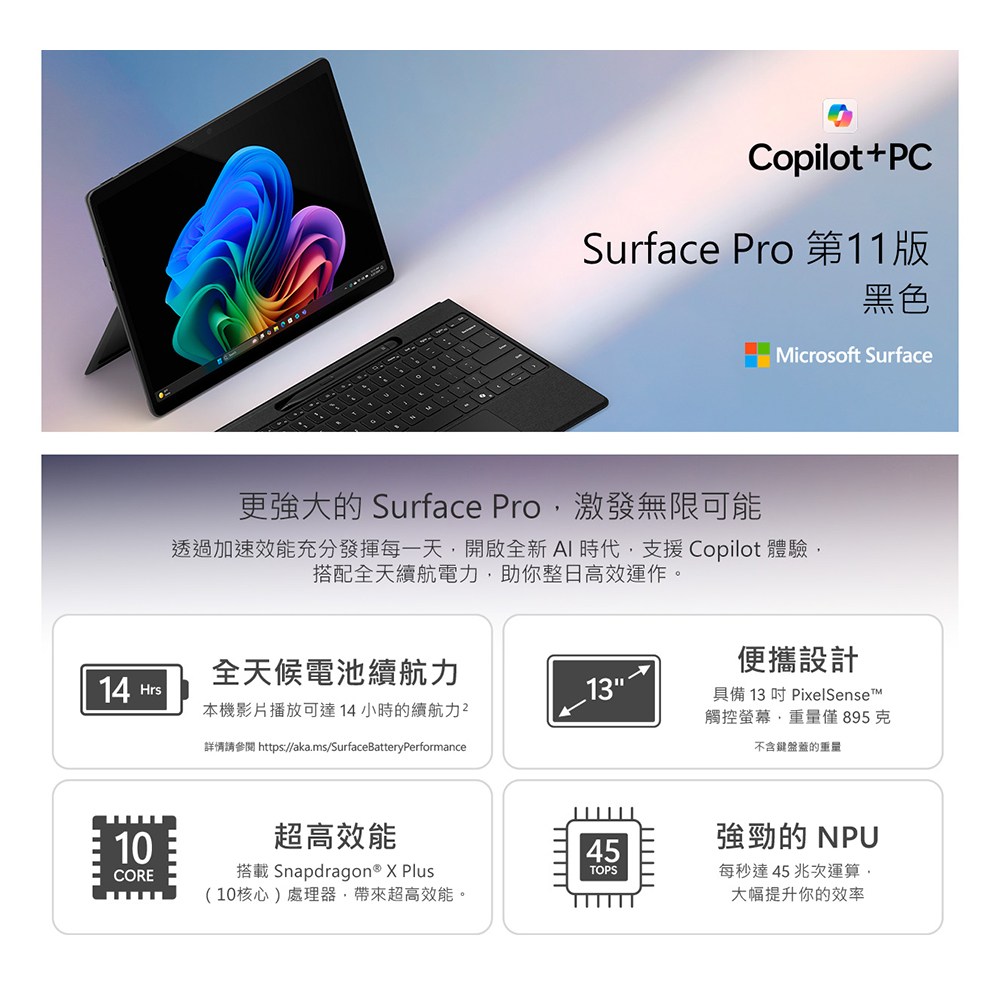 Microsoft Surface Pro 第11版是一款輕薄觸控筆電,配備13吋螢幕,提供出色的視覺體驗。搭載WIN11 Home系統,操作流暢,介面友善,讓您輕鬆上手。16GB記憶體與512GB SSD固態硬碟,確保多工處理與資料存取的高效性。黑色外觀設計簡約時尚,彰顯您的個人品味。無論是工作還是娛樂,Surface Pro 第11版都能滿足您的需求,是您理想的行動辦公夥伴。