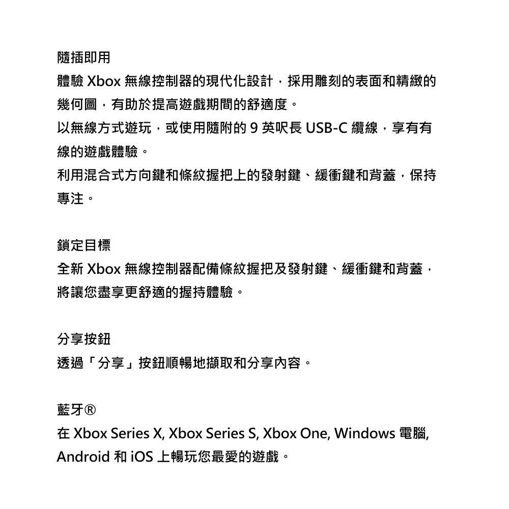 - 體驗Xbox無線控制器的現代化設計,雕刻表面提升遊戲舒適度,讓您長時間暢玩。