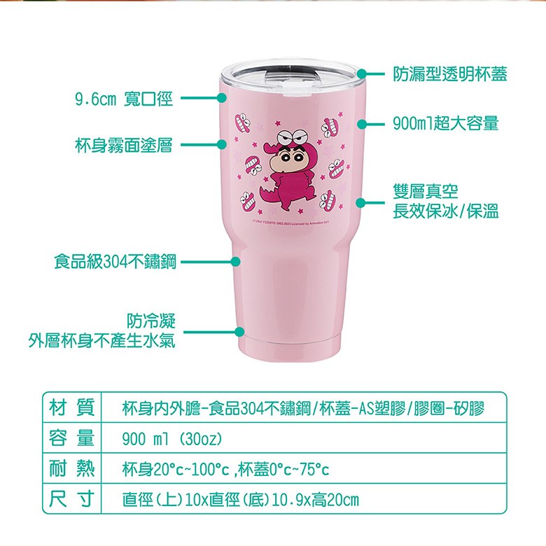 這款Miravivi蠟筆小新冰霸杯,容量高達900ml,採用食品級304不銹鋼內膽,確保飲用安全與衛生。杯身設計可愛,印有蠟筆小新睡衣圖案,讓您在享受飲品的同時,也能感受到童趣。雙層真空隔熱技術,有效保溫保冷,無論是冰涼飲品還是熱咖啡,都能長時間保持最佳溫度。防漏杯蓋設計,讓您外出攜帶更加安心,不必擔心飲品灑出。無論是在辦公室、家中還是戶外,這款冰霸杯都是您理想的飲品伴侶。