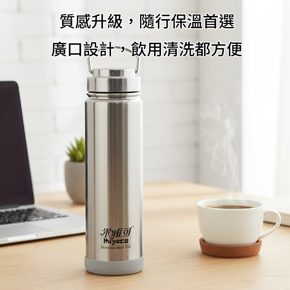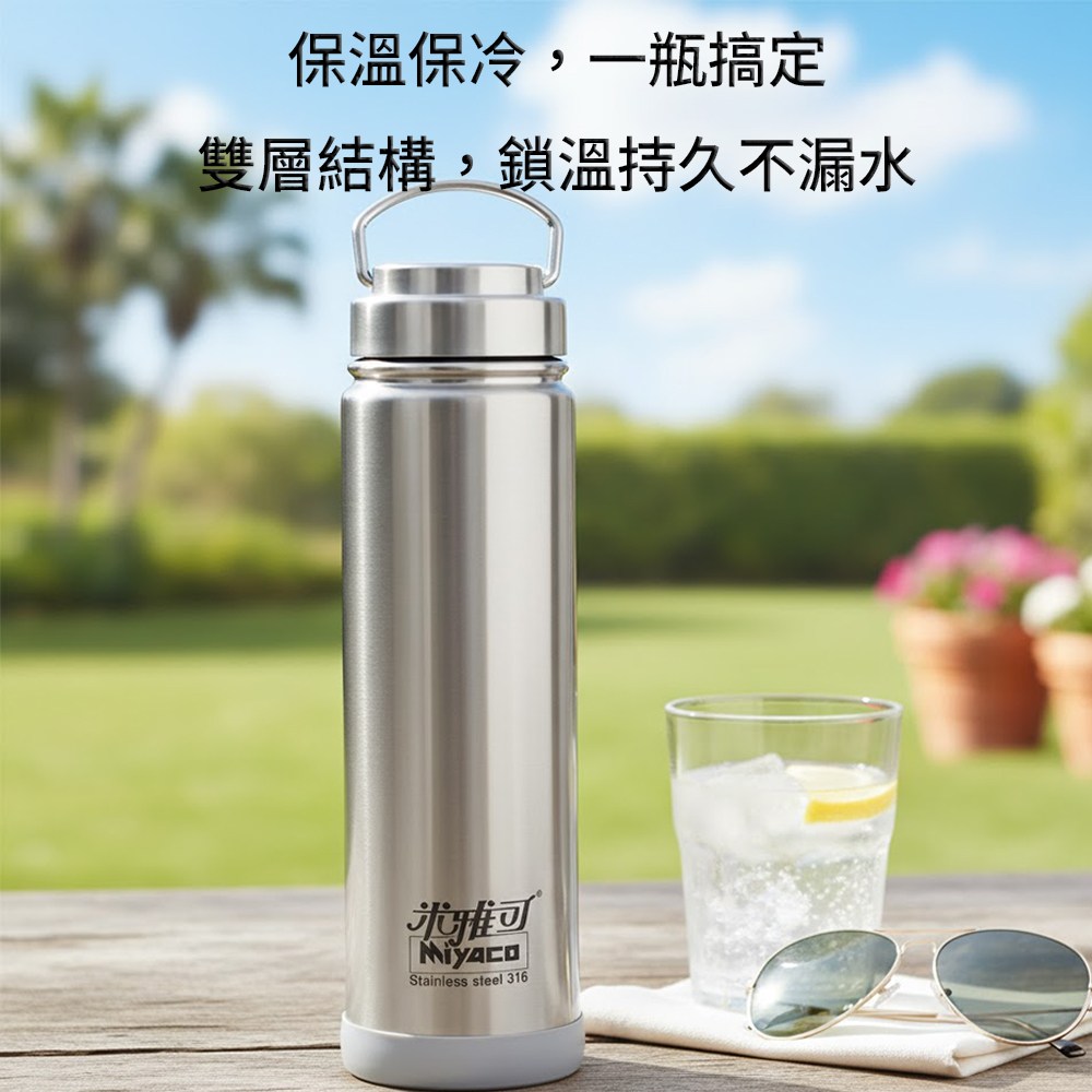 MiyAco 米雅可經典316不銹鋼廣口真空保溫瓶,是您健康生活的理想之選。採用頂級316不銹鋼材質,具有卓越的耐酸鹼和耐腐蝕性能,確保飲品安全無虞。750ml大容量設計,滿足您一天的飲水需求,無論是辦公室、戶外運動還是旅行,都能隨時隨地享受健康飲品。廣口設計方便清洗,讓您輕鬆保持清潔衛生。真空保溫技術,長效保溫保冷,讓您隨時享受適溫飲品。不銹鋼色外觀簡約時尚,彰顯您的品味。