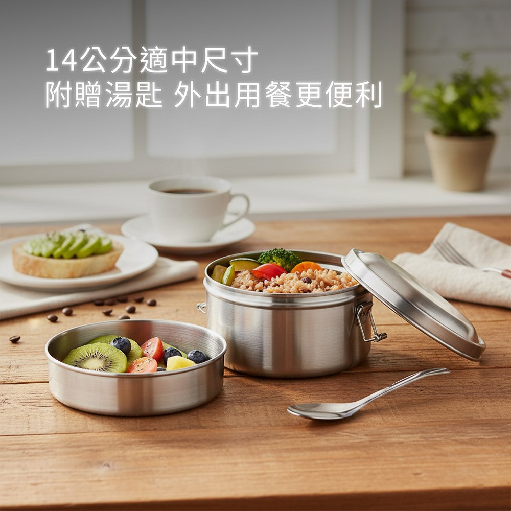 Miyaco米雅可經典316不鏽鋼雙層圓形便當盒,是您健康飲食生活的好夥伴。採用頂級316不鏽鋼材質,耐酸鹼、抗腐蝕,確保食材安全無虞。雙層設計有效分隔食物,避免串味,讓您隨時隨地都能享用美味佳餚。14公分適中尺寸,方便攜帶,附贈湯匙,貼心周到。通過SGS檢測,符合食品器具衛生標準,品質值得信賴。