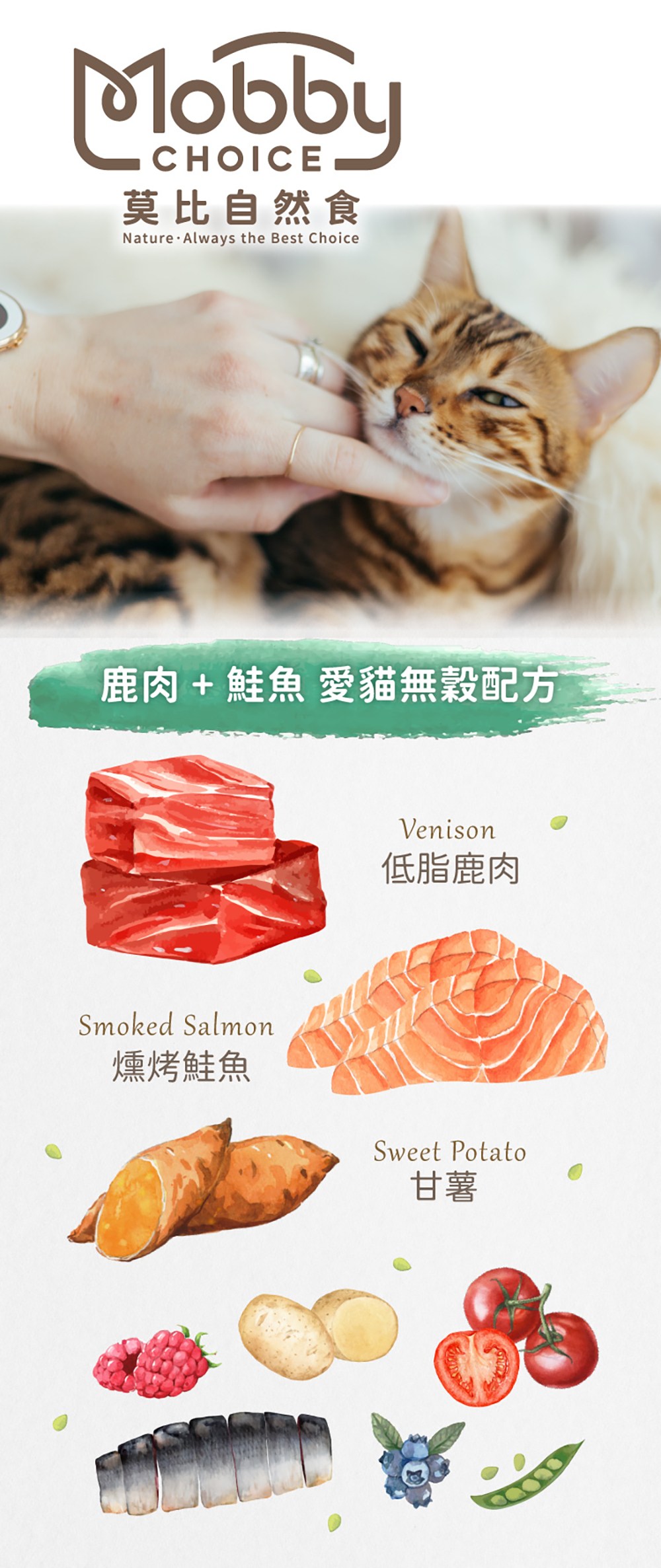 - 鹿肉與鮭魚雙重美味,提供豐富蛋白質,滿足貓咪的味蕾,挑嘴貓也愛不釋手。