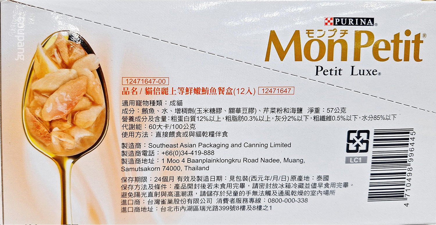 MonPetit 貓倍麗上等鮮嫩鮪魚餐盒,為您的愛貓提供極致的味蕾享受。每盒包含12個57克的餐盒,選用上等鮮嫩鮪魚,確保提供優質蛋白質,滿足成貓的營養需求。這款濕糧不僅美味,還能幫助貓咪補充水分,維持泌尿系統健康。獨立餐盒設計方便餵食,保持食物新鮮,讓您的愛貓每一餐都吃得開心又安心。MonPetit 貓倍麗,給您的愛貓帶來奢華的用餐體驗。