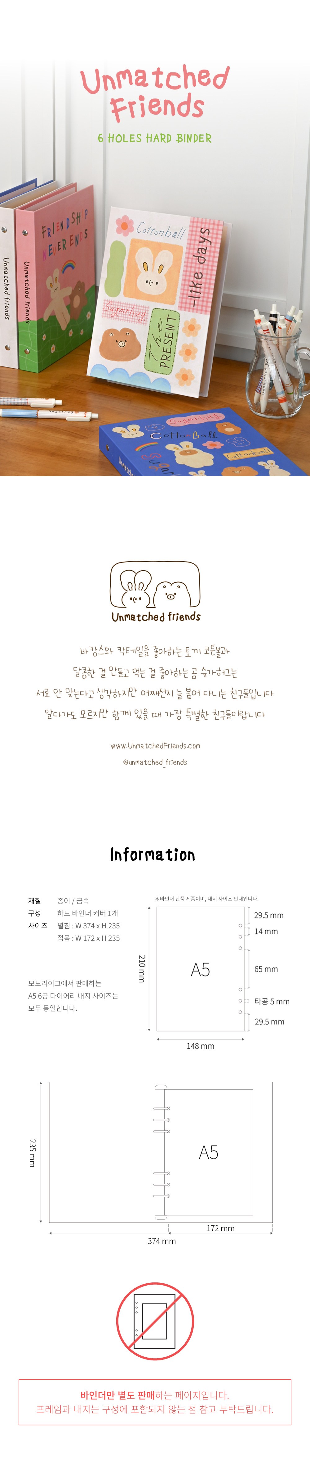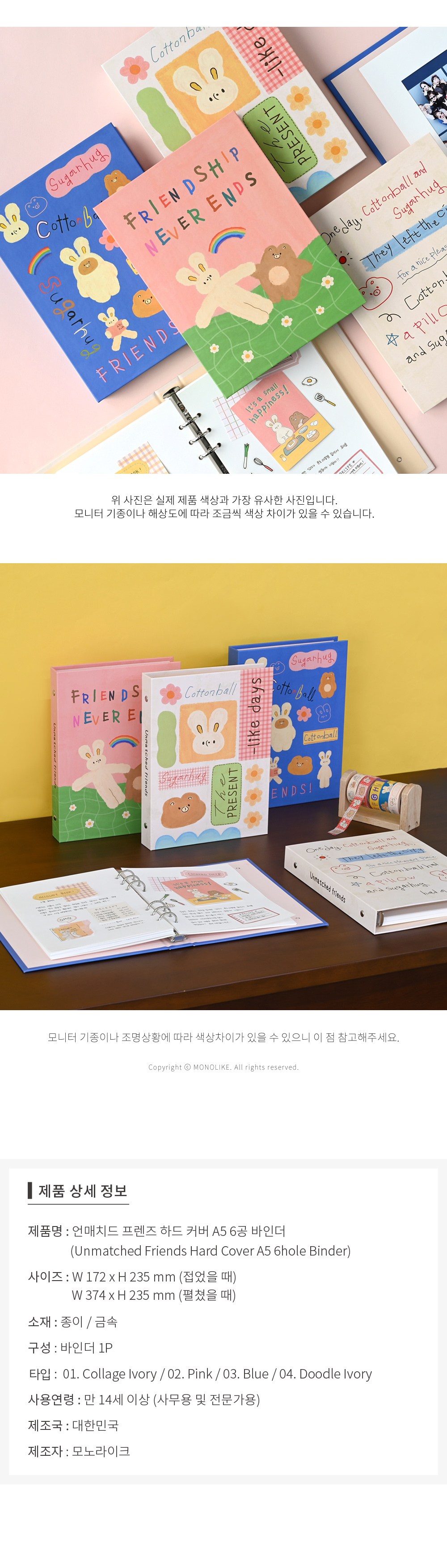 Monolike Unmatched Friends硬殼A5六孔活頁夾,採用堅固的硬殼封面,能有效保護內頁,防止摺疊和損壞。活頁夾設計方便您隨時替換內頁,根據不同需求進行調整,打造個人化的筆記本。可愛的Unmatched Friends圖案,為您的生活增添一絲趣味。藍色系的清新色彩,讓您在書寫時也能擁有好心情。無論是辦公還是學習,這款活頁夾都是您的理想選擇。