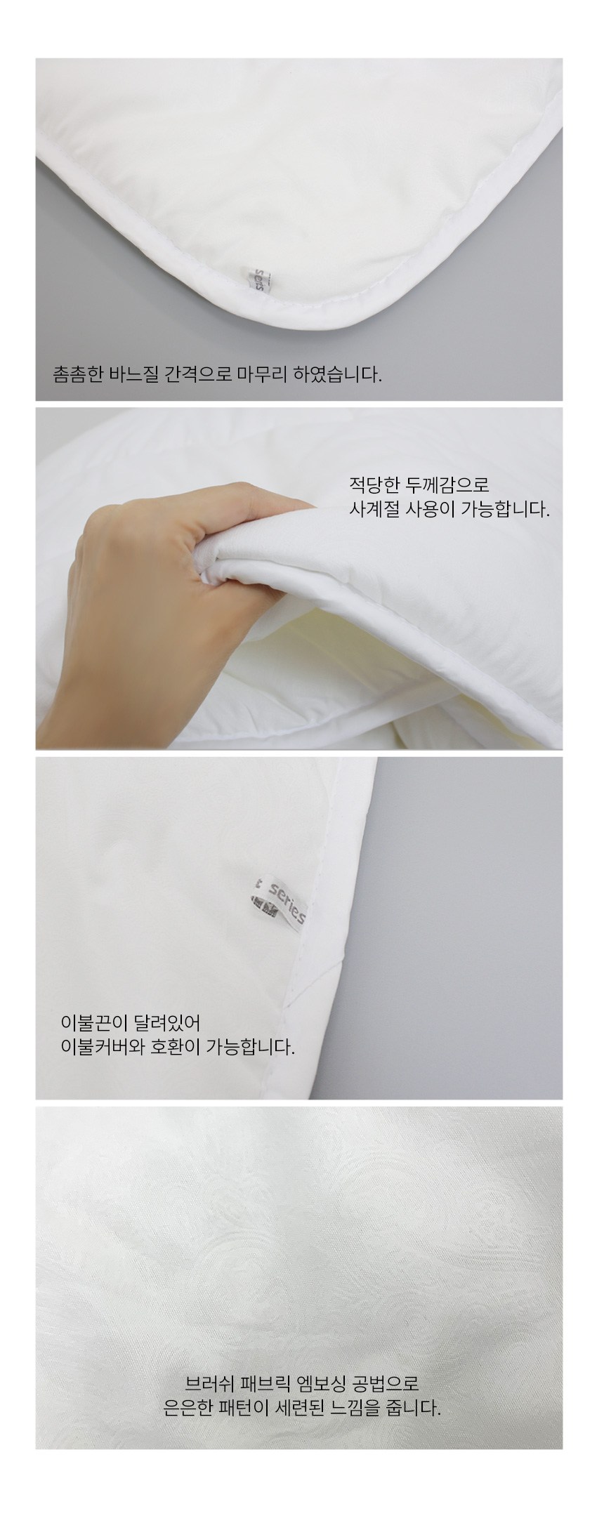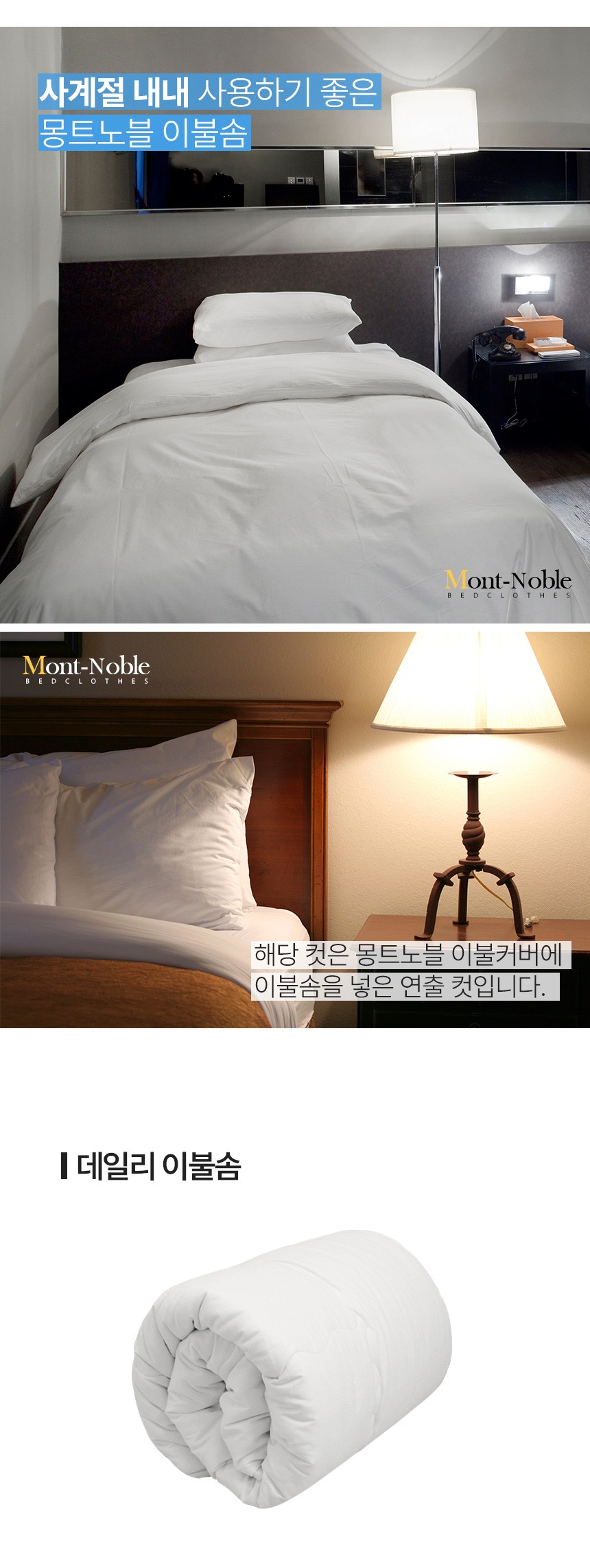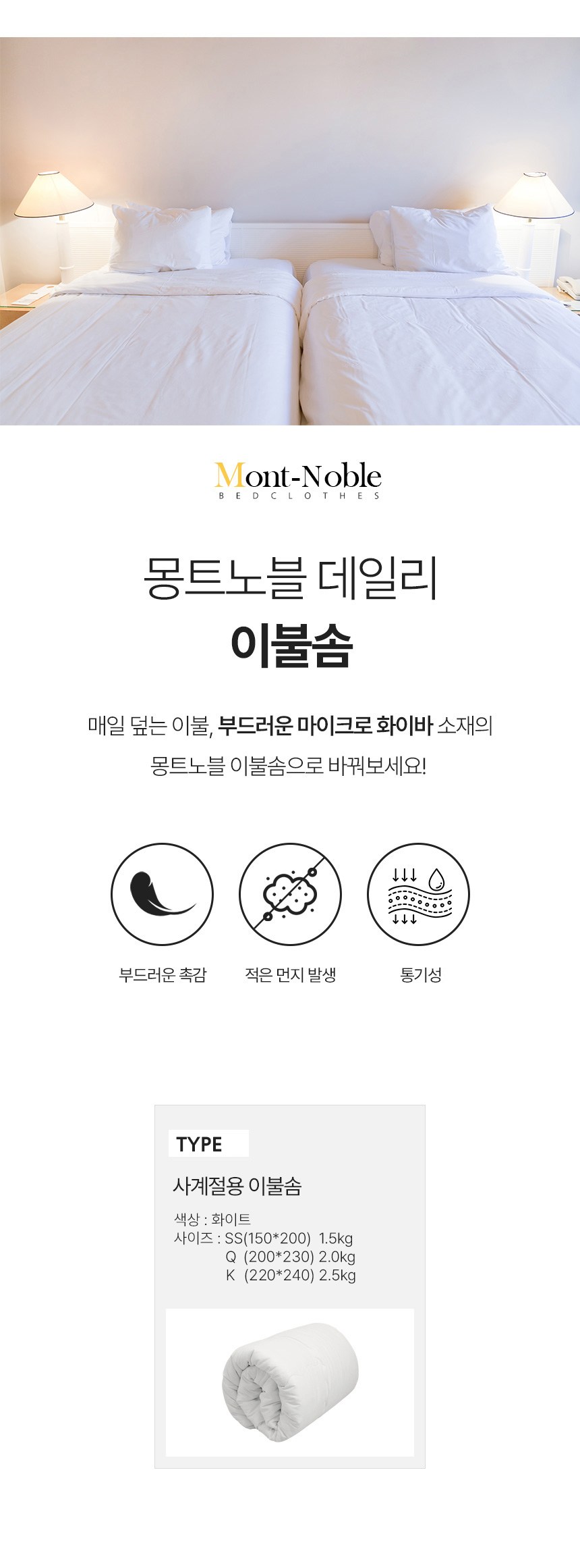 Mont-Noble四季用棉被芯,採用柔軟超細纖維材質,觸感輕柔,透氣性佳,為您打造舒適的睡眠環境。此款棉被芯厚薄適中,四季皆宜,讓您在不同季節都能享受舒適的睡眠溫度。簡約的白色設計,易於搭配各式被套,輕鬆打造個人風格寢室。棉被芯附有棉被繩,可與被套固定,防止滑動。建議乾洗,保持清潔衛生,延長使用壽命。