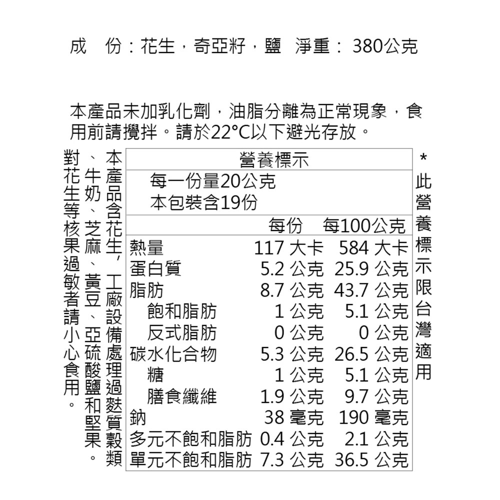- 享受濃郁花生醬與奇亞籽的完美結合,口感豐富有層次,美味又健康。
