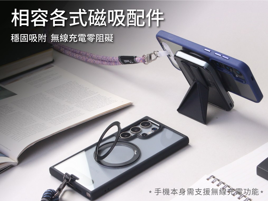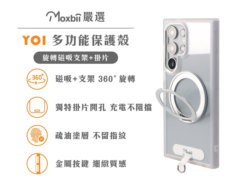 這款三星 S24 Ultra YOI 旋轉磁吸支架保護殼套組,結合了銀月白、航太銀與白色掛片,打造出時尚又實用的手機配件。保護殼採用防摔軟邊框與 PC 硬背板一體式設計,提供卓越的保護力,同時保持輕薄手感。內建的鋁合金磁吸支架可 360 度旋轉,方便您在任何角度觀看影片或進行視訊通話,獨特的掛片設計讓充電不受阻礙,金屬按鍵則提供細膩的質感,讓您的手機不僅安全,更展現個人品味。