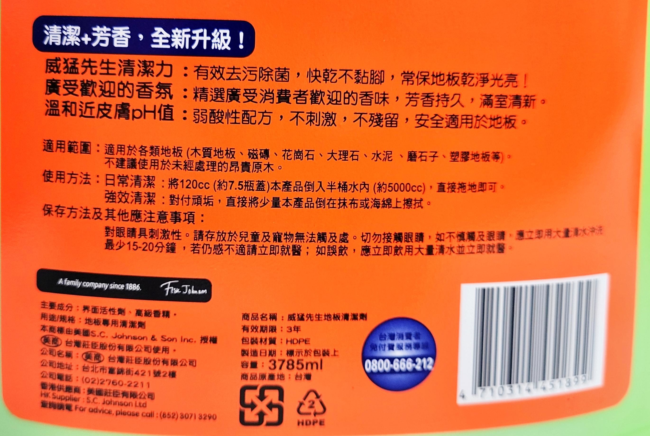- 威猛先生地板清潔劑,輕鬆去除頑固污漬,讓地板恢復原有的潔淨光亮,居家環境煥然一新。
