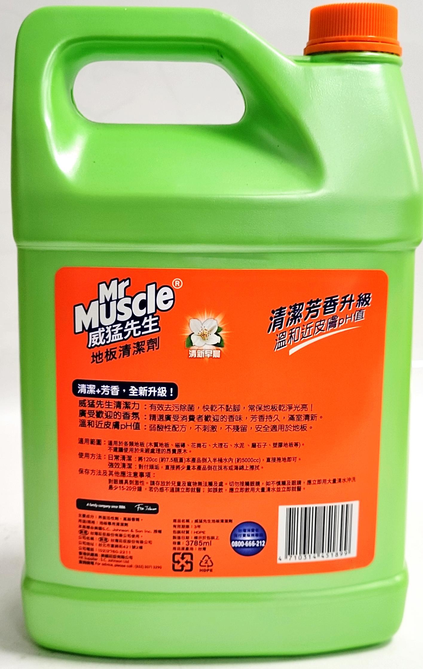 Mr Muscle 威猛先生地板清潔劑,清新早晨香味,讓您的地板煥然一新!這款加侖桶裝清潔劑容量為3785ml,能有效去除地板上的污垢和細菌,讓地板潔淨光亮,同時散發清新怡人的香氣。其溫和配方接近皮膚pH值,不刺激皮膚,使用更安心。適用於各種地板材質,如木質地板、磁磚、大理石等,是您居家清潔的好幫手。選擇Mr Muscle,輕鬆打造潔淨舒適的居家環境。