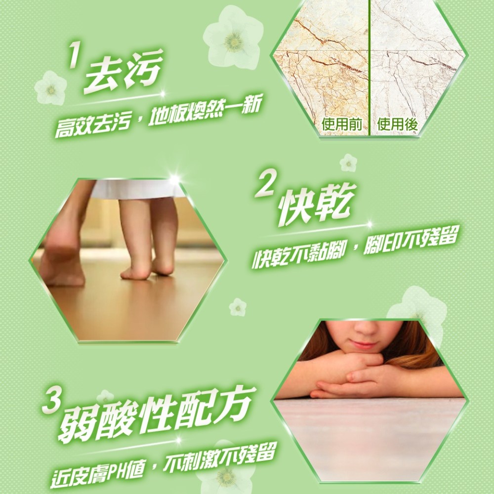 - 獨特配方能有效去除地板污垢,不留黏膩感,讓居家環境更加乾淨舒適。