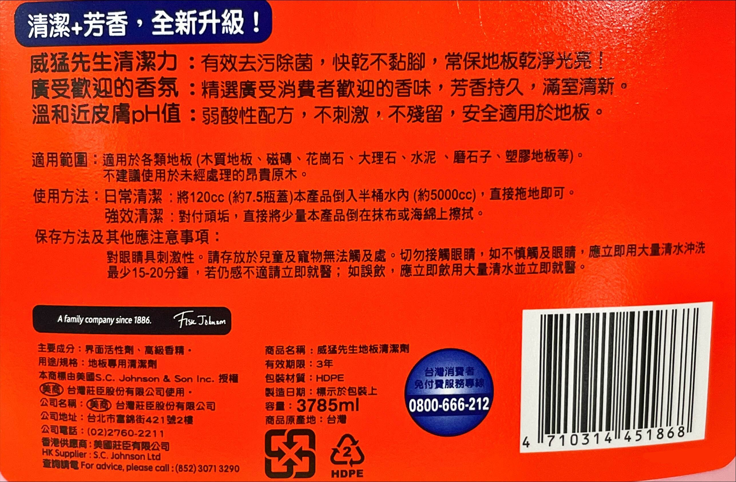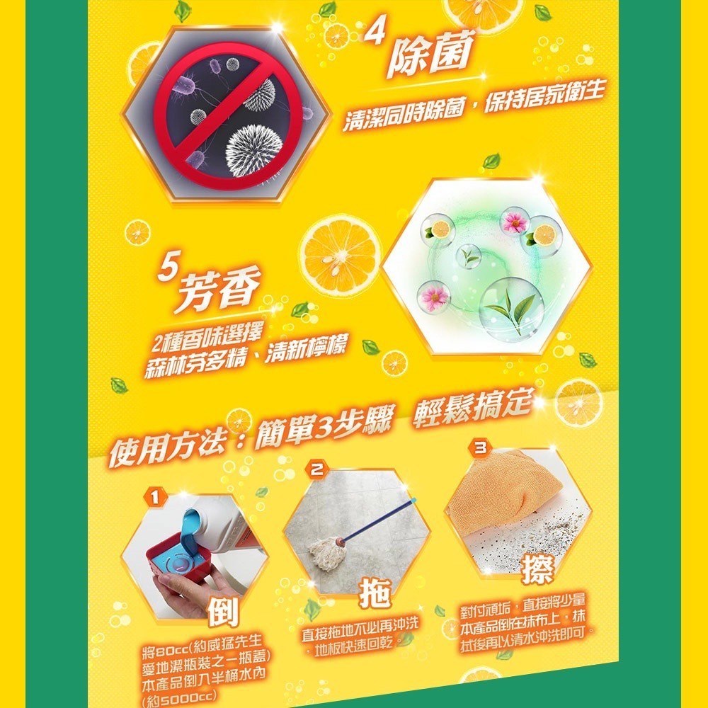 - 威猛先生地板清潔劑,輕鬆去除頑固污漬,讓地板恢復原有的潔淨光亮。
