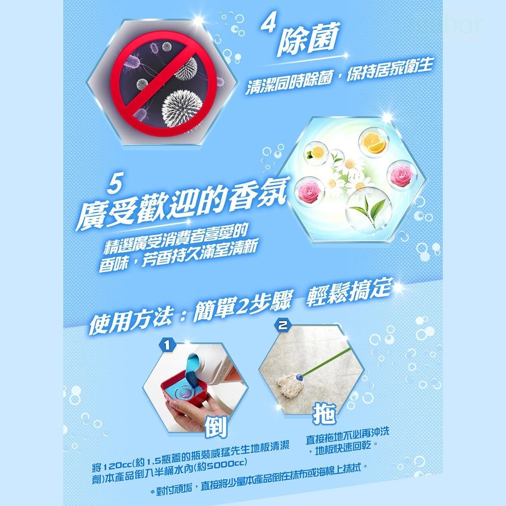 - 威猛先生地板清潔劑,輕鬆去除地板頑固污漬,讓居家環境煥然一新,享受潔淨。