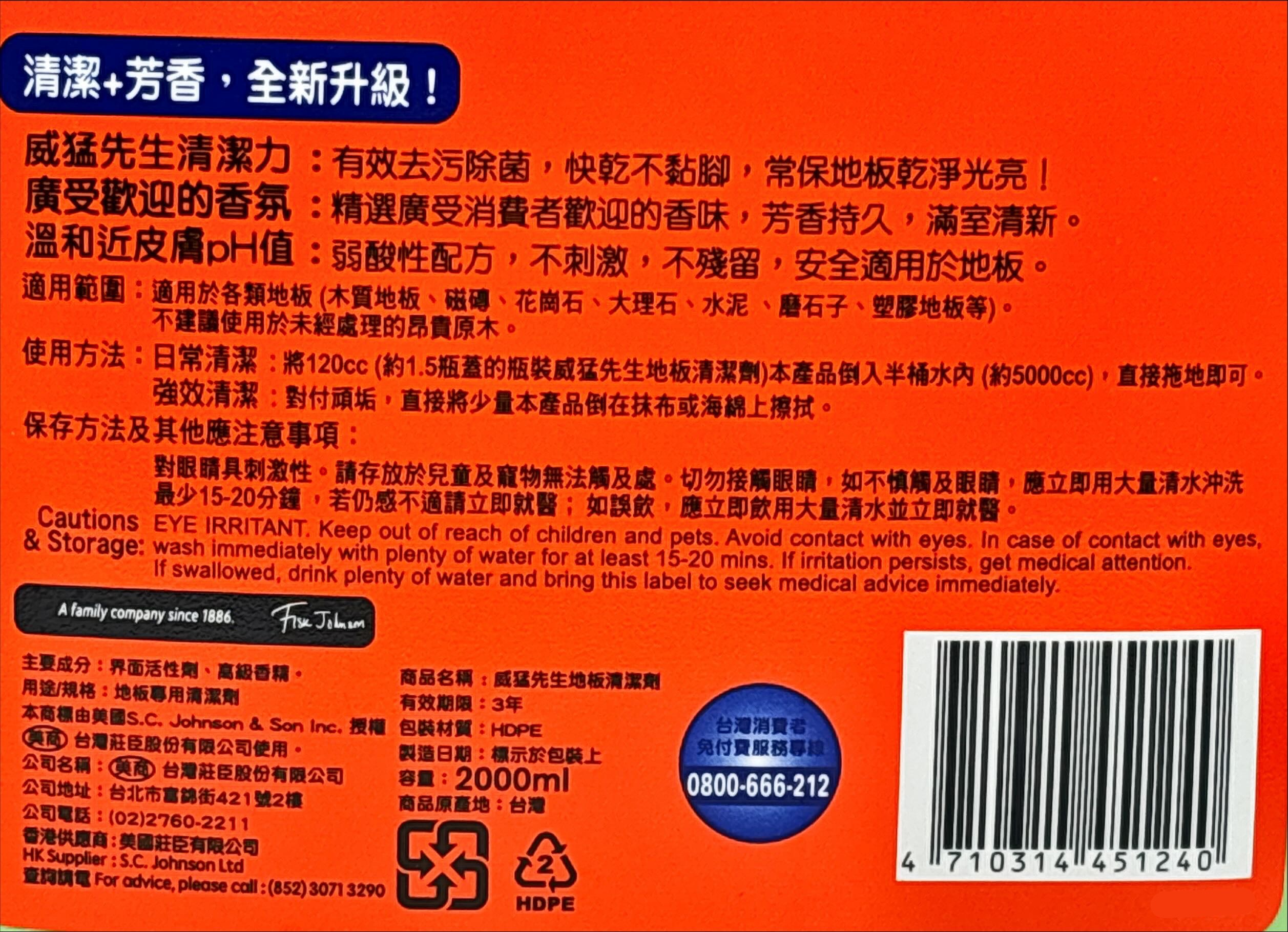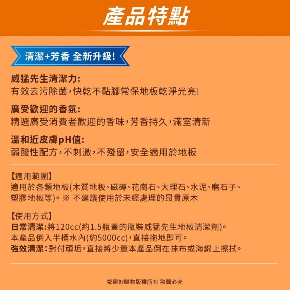 - 威猛先生地板清潔劑,讓您輕鬆去除地板污垢,享受清新潔淨的居家環境,感受舒適的居家體驗。