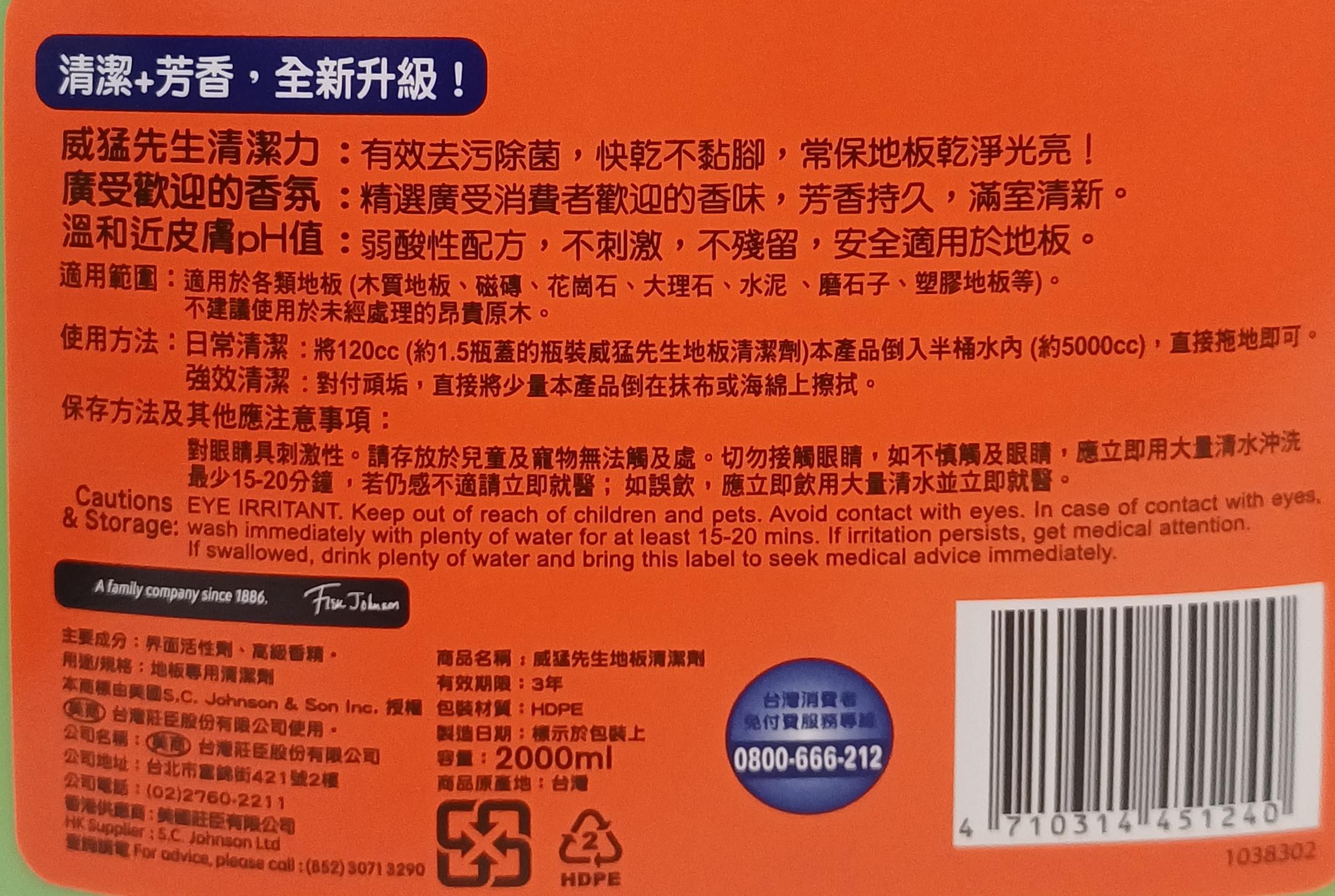 - 威猛先生地板清潔劑,輕鬆去除頑固污漬,讓您的地板恢復光亮潔淨,省時省力。