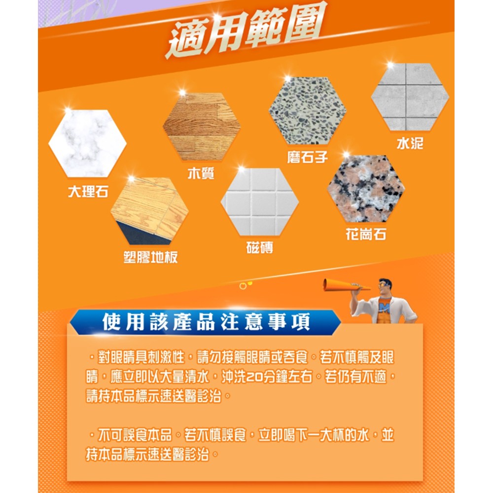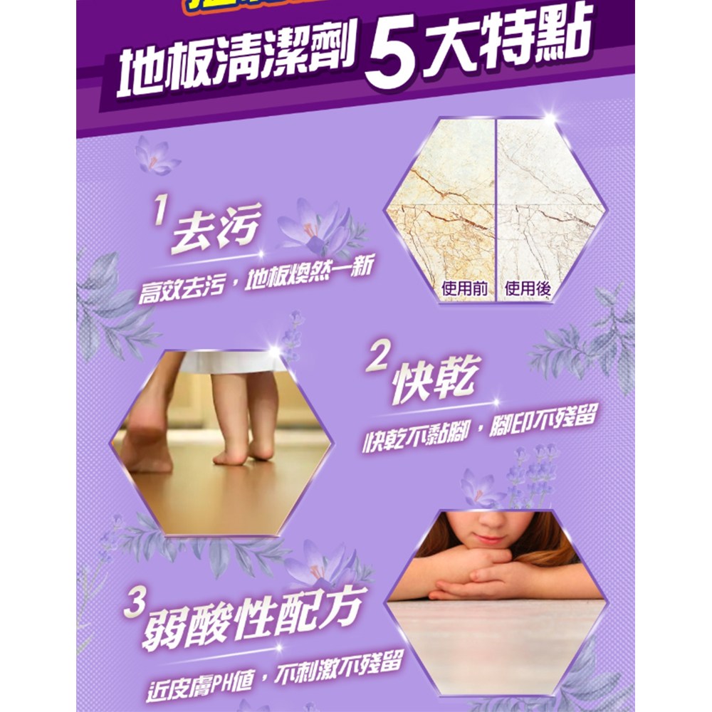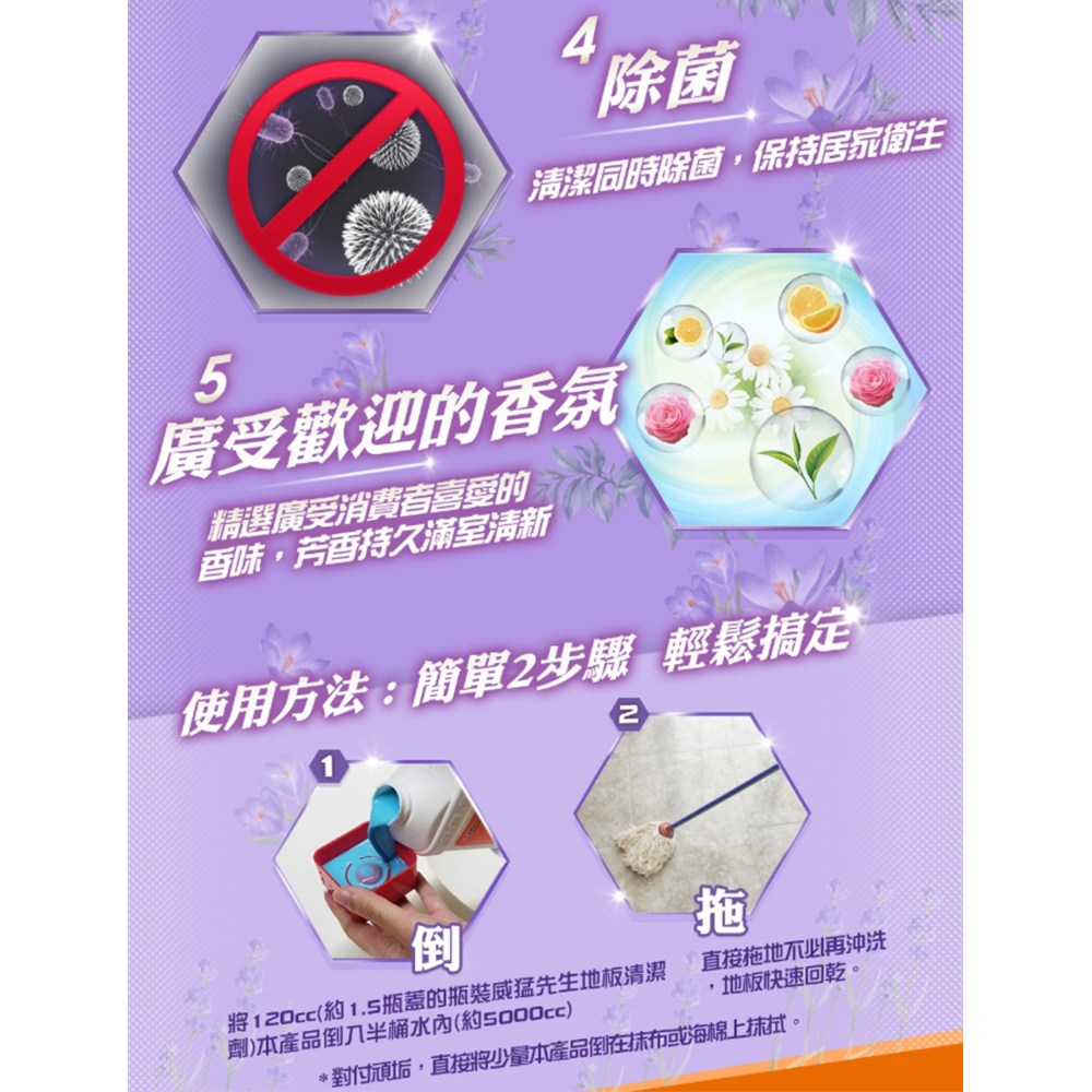 - 威猛先生地板清潔劑,讓您輕鬆享受薰衣草的清新香氣,清潔同時放鬆身心。