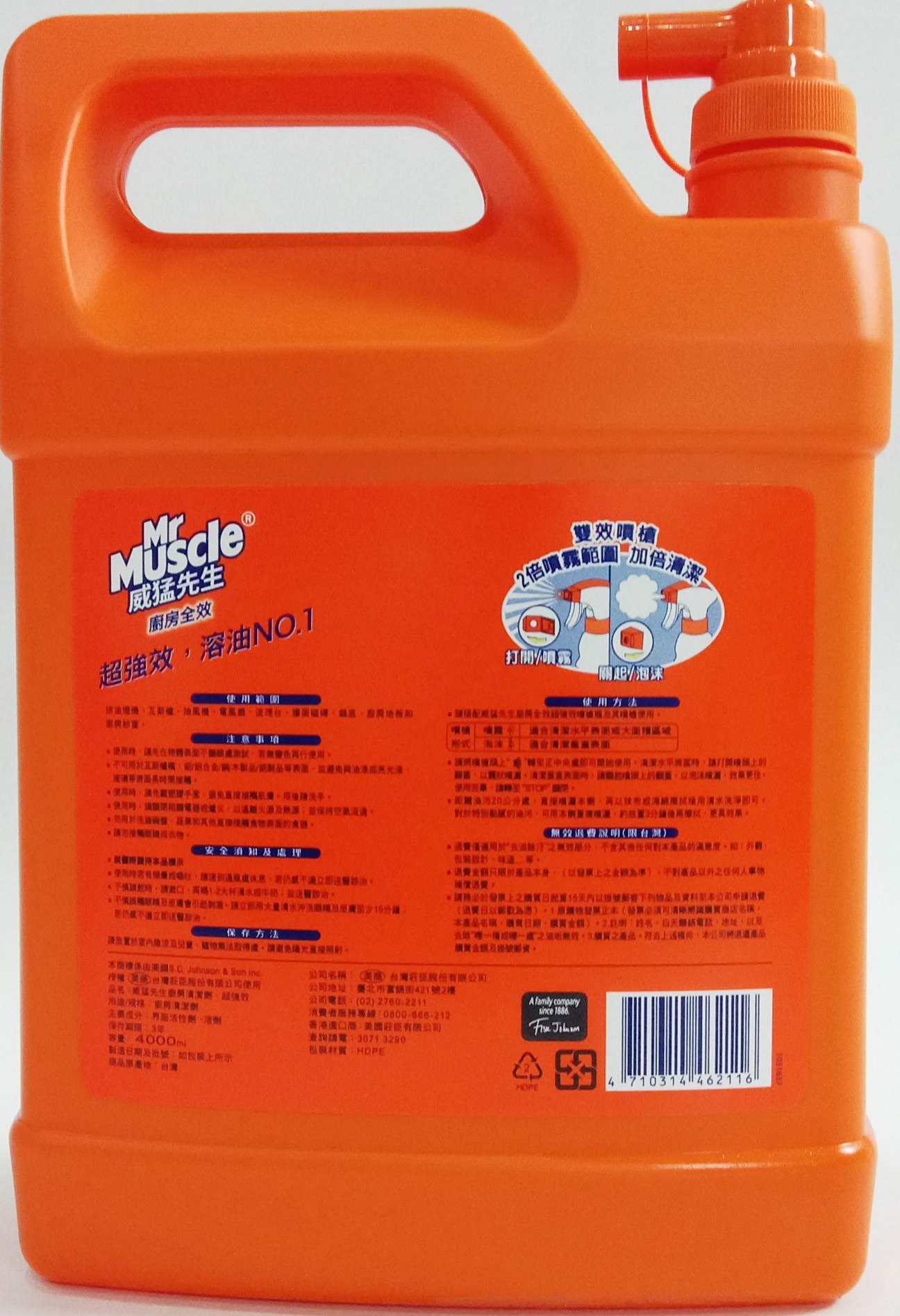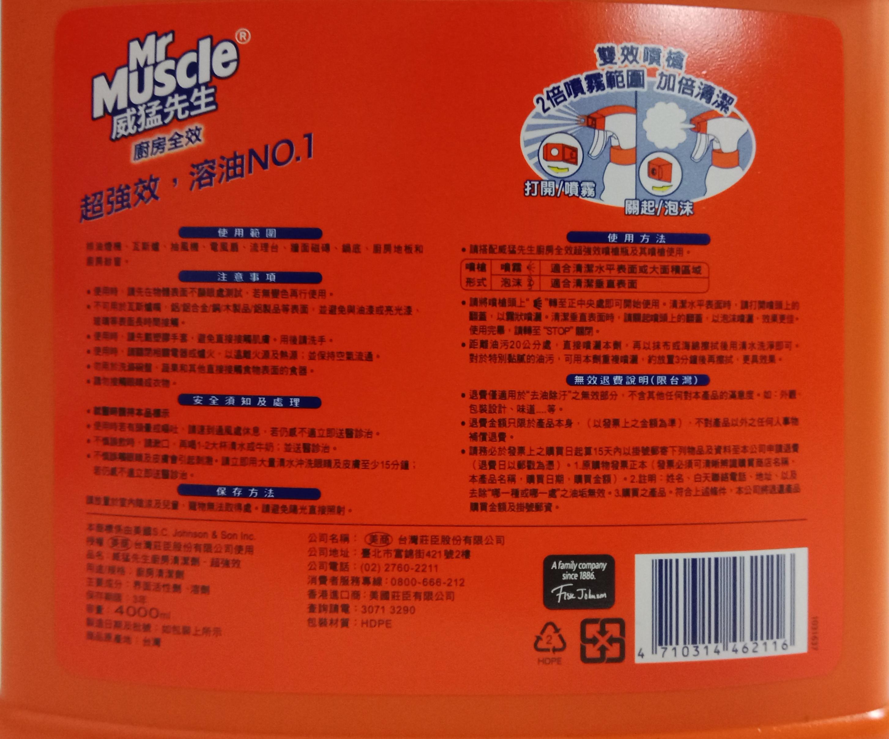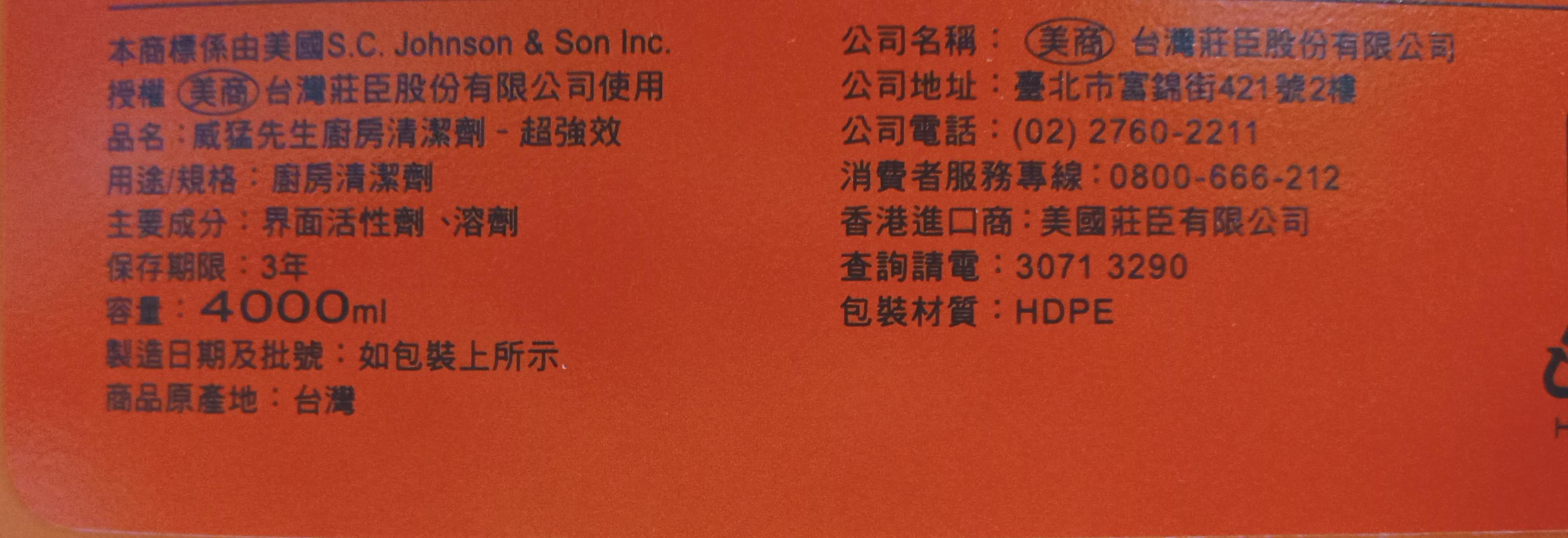 威猛先生超強效廚房清潔劑,4000ml大容量加侖桶裝,是您廚房清潔的最佳選擇。本產品能快速溶解爐灶、烤箱、烤架、水槽和檯面上的頑固油污和燒焦食物殘渣,無需費力刷洗,輕鬆恢復廚房表面的光潔如新。無香味配方,不含研磨劑,適用於各種廚房表面,讓您安心使用。超強效配方能快速作用,節省您的清潔時間,讓您有更多時間享受生活。選擇威猛先生,讓您的廚房清潔變得輕鬆又高效。