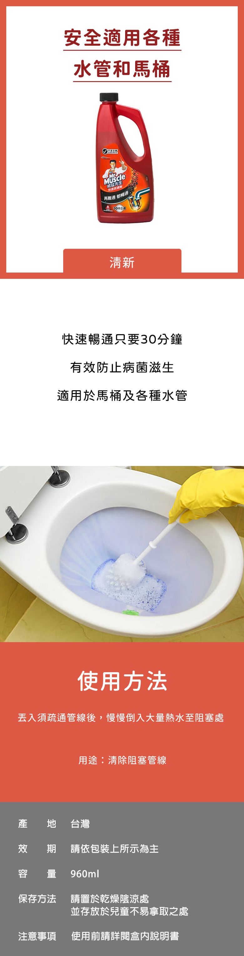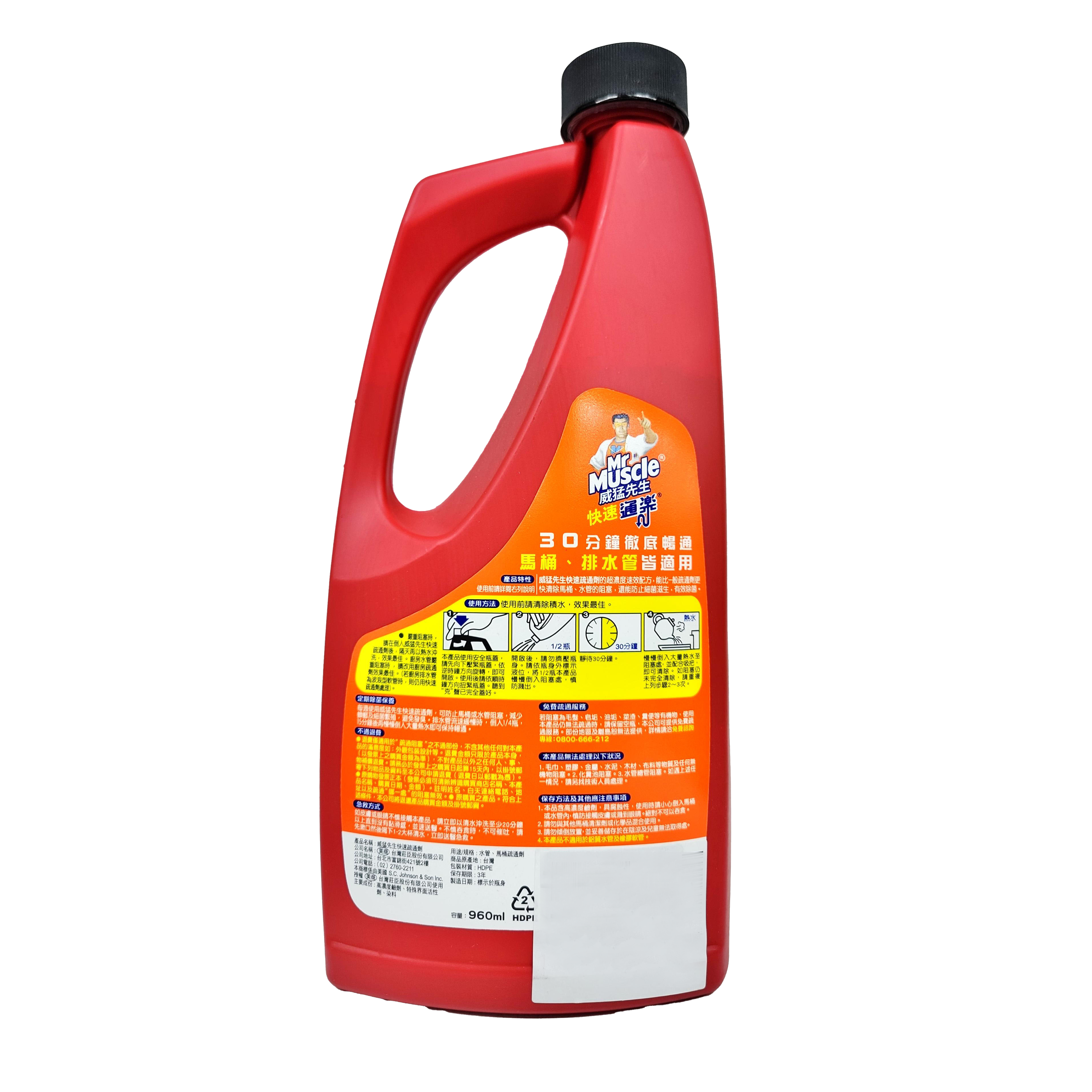 威猛先生快速疏通劑,輕鬆解決排水管堵塞問題!獨特配方能迅速溶解毛髮、油脂和食物殘渣等堵塞物,只需30分鐘即可恢復排水暢通。適用於各種水管和馬桶,安全有效。960ml大容量,讓您長期擺脫堵塞困擾。使用前請詳閱說明書,確保使用安全。