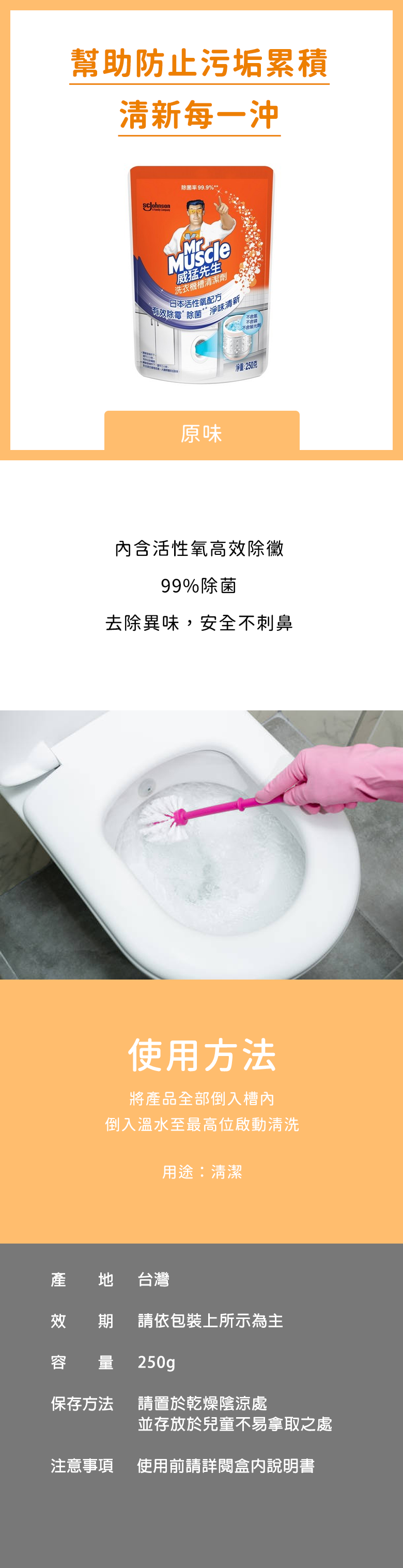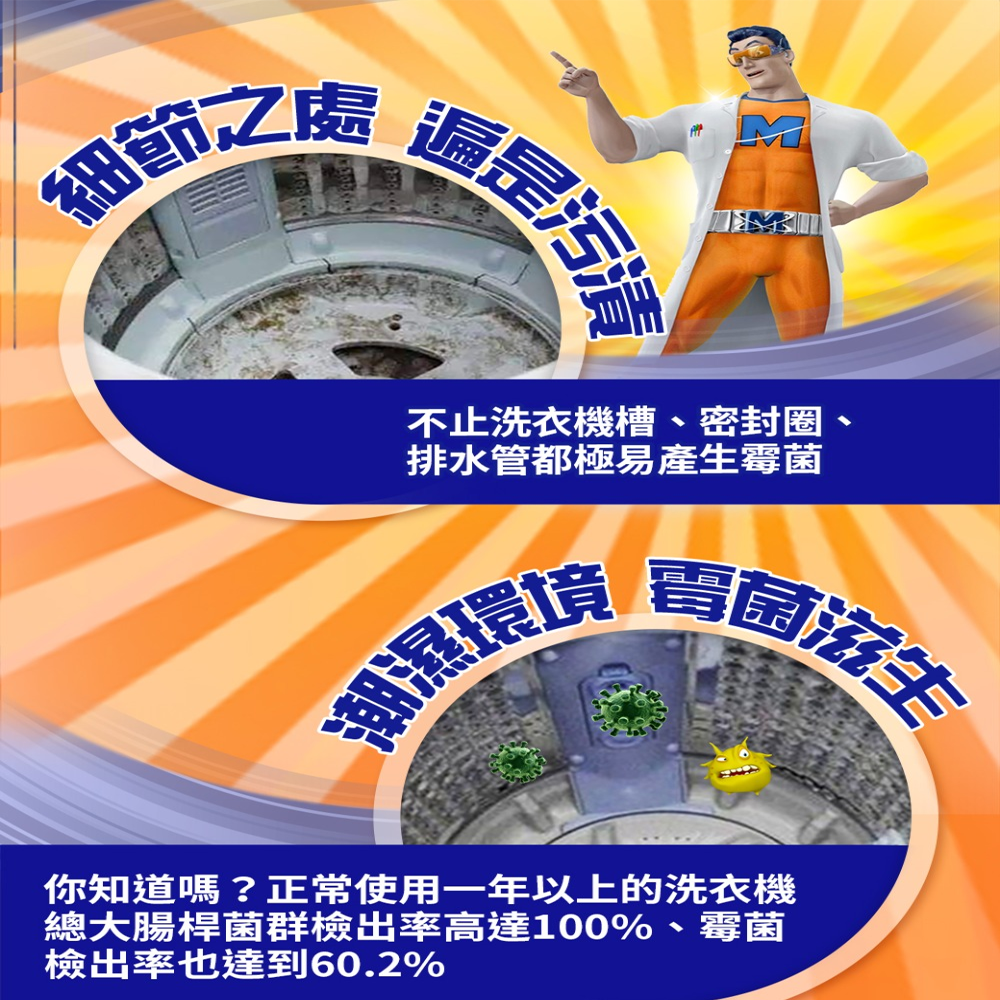 - 威猛先生清潔劑能深入洗衣機槽,有效去除隱藏的污垢和細菌,讓洗衣環境更衛生。