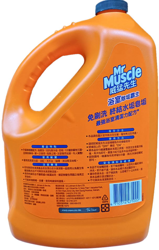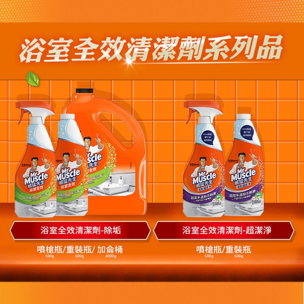 - 威猛先生浴室清潔劑,輕鬆去除浴室頑固水垢,讓清潔變得更省力,享受潔淨體驗。